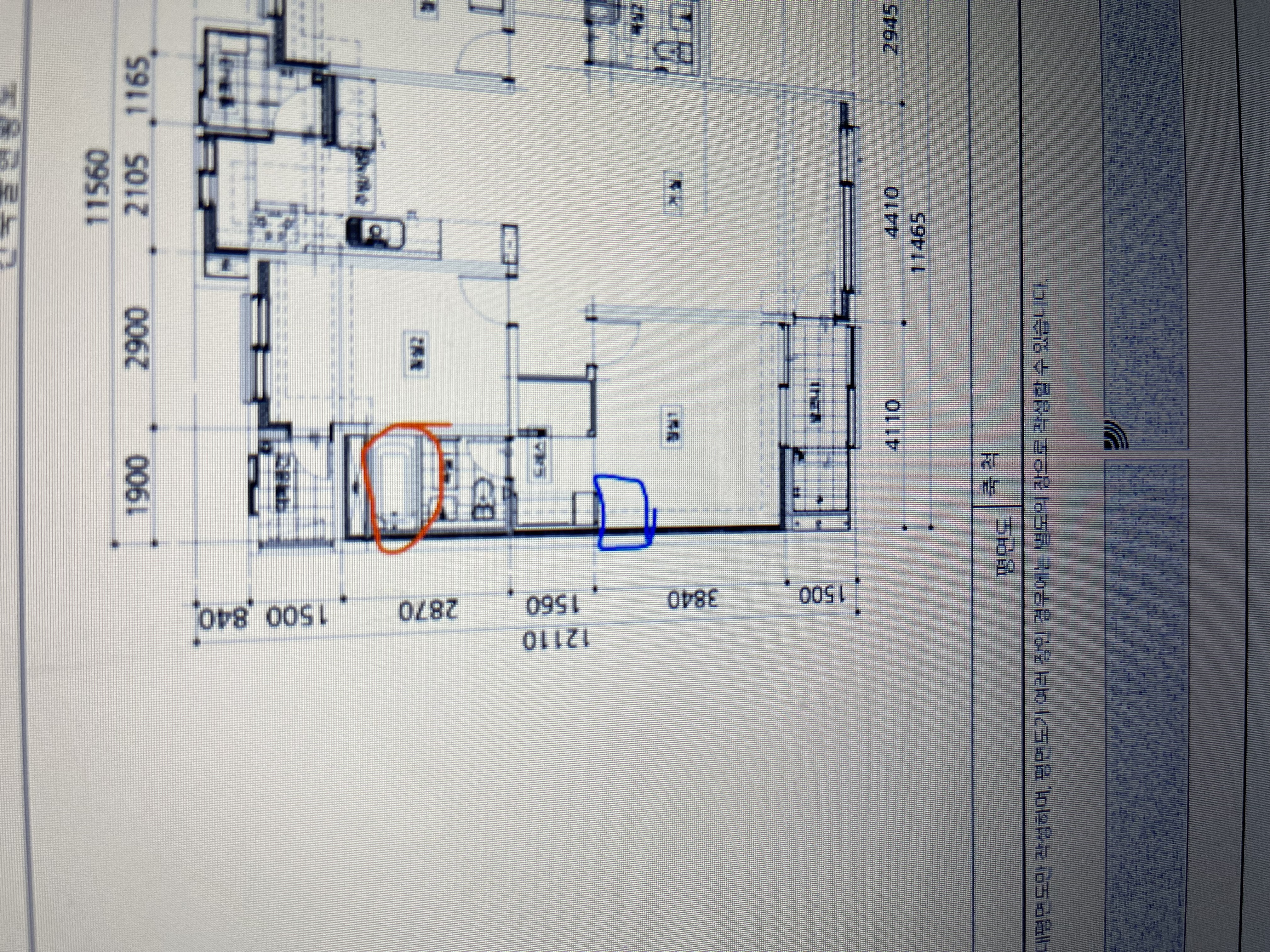 파란색칠한곳이 안방 드레스룸끝 아래부분을 일부 잘라내서확인했던곳이고 빨간색이.아랫집 안방 화장실.천장 분배기 위치인