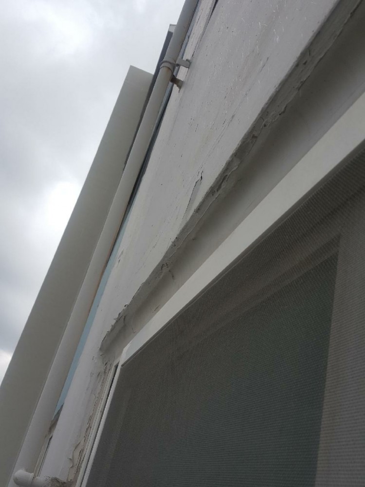 원인은... 외벽에 페인트가 벗겨져서 벌어진 부분이 있는데요.. 외부측의 실리콘실란트가 도장면을 붙잡고 일어난 부분이 있을 겁니다.