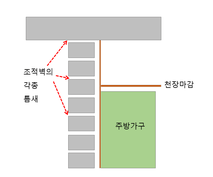 그럼 일단.. 주방 쪽 벽이 조적벽이고, 그 벽이 시공이 부실하다는 의심을 할 수 있는데요.
