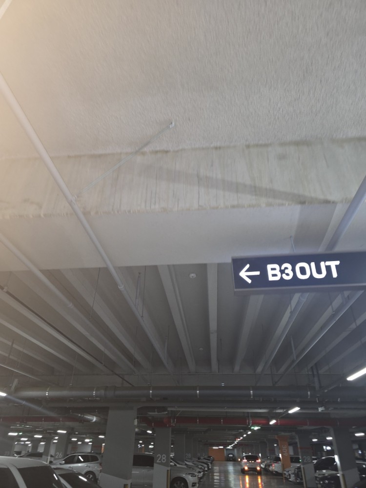 B주차장에는 무기질계 뿔칠이 동 입구쪽만 되어있고 다 살펴보진 않았으나 중간에 설치가 안되어있는데