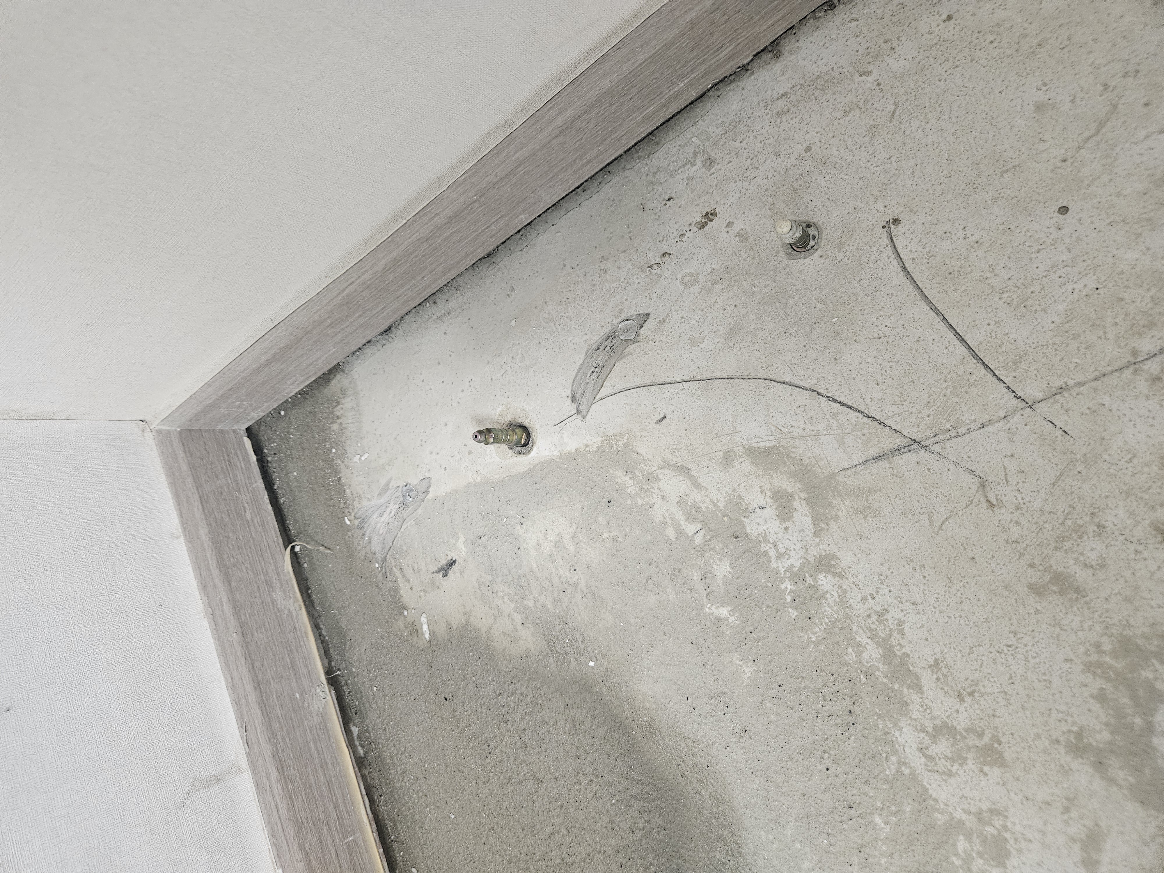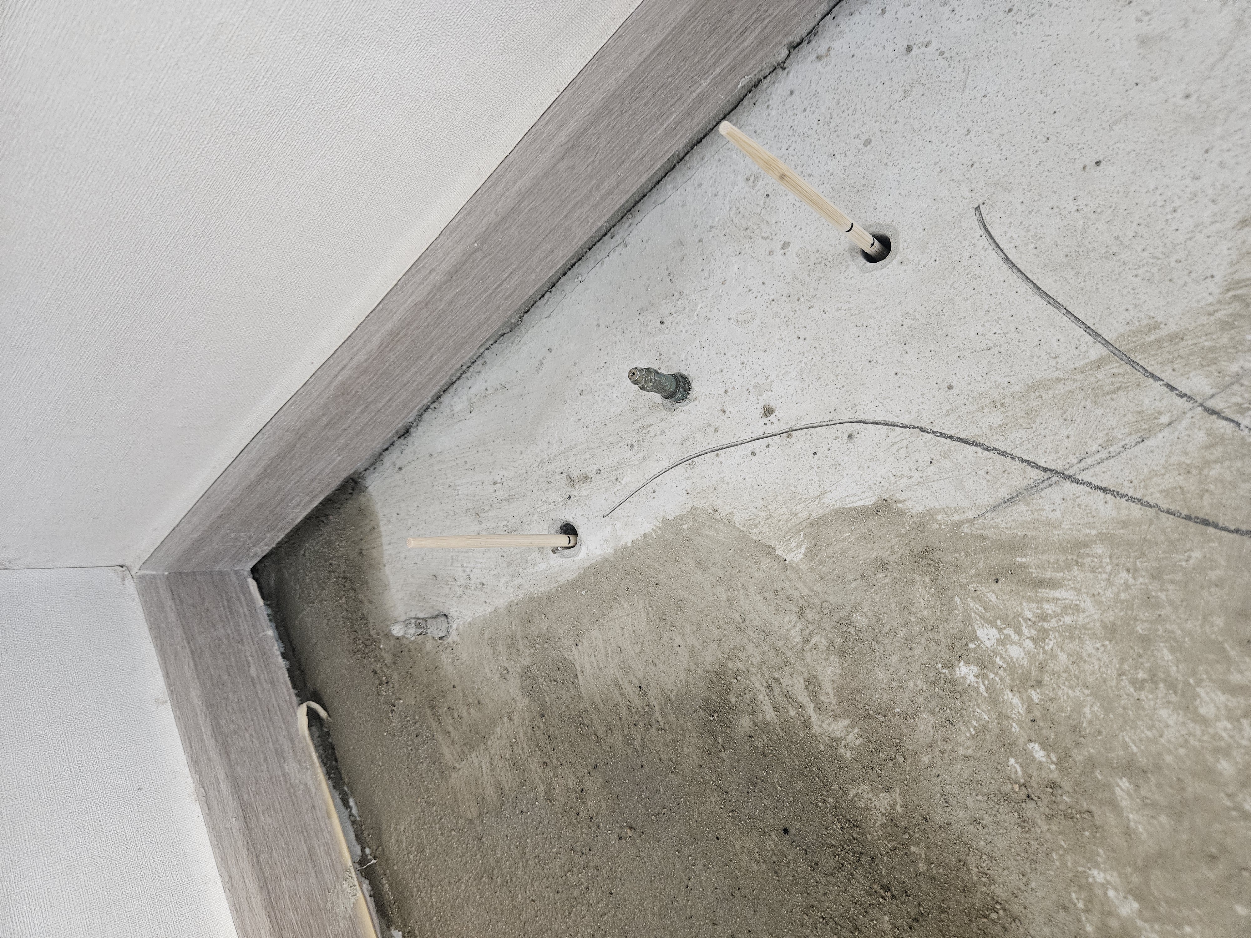아파트 바닥의 모서리부분의 움직임으로 건설사에서 문제를 인지하고 하자보수를 진행하면서 해당 부위에 어제 천공을 하고 DEL090의 에폭시레진을 이용하여 충진을 했습니다.(작업자가 8cm천공 한다고 했습니다.)