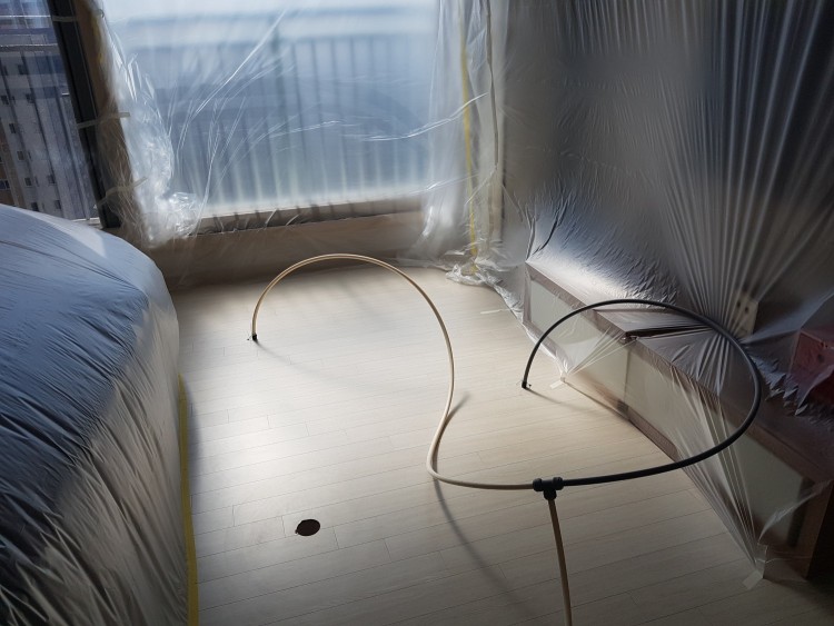 입주전 1차 공사를 하였습니다 3주가량 전체 철거(강마루,붙박이,석고 등  전체)후 바닥은 측면완충제 부분만 제거구멍은 뚫지않고 3주정도 보일러가동 , 제습기 가동하였습니다