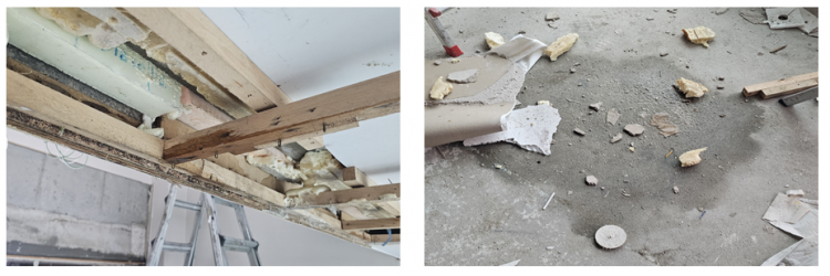 시스템에어컨 공사를 위해 거실 확장부 천장 석고보드를 자르는 과정에서 누수가 있어 확장부 석고보드 전체가 떨어지면서 한쪽에서 일부 물이 떨어졌다는 얘기를 듣고 관리사무소에 연락 후 현장에 방문했습니다.