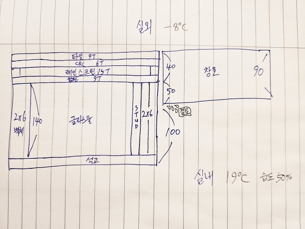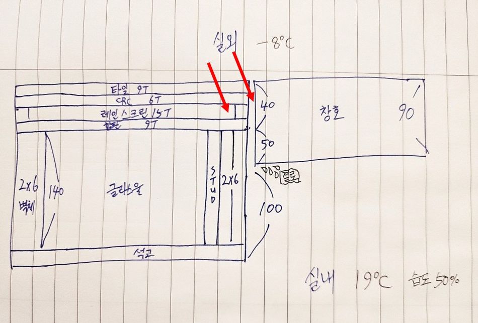 실내 창틀쪽의 단열 두께가 거의 안나와서 (50mm로 보이지만 스터드때문에 사실상 단열두께가 30mm정도 밖에 안되는셈입니다)