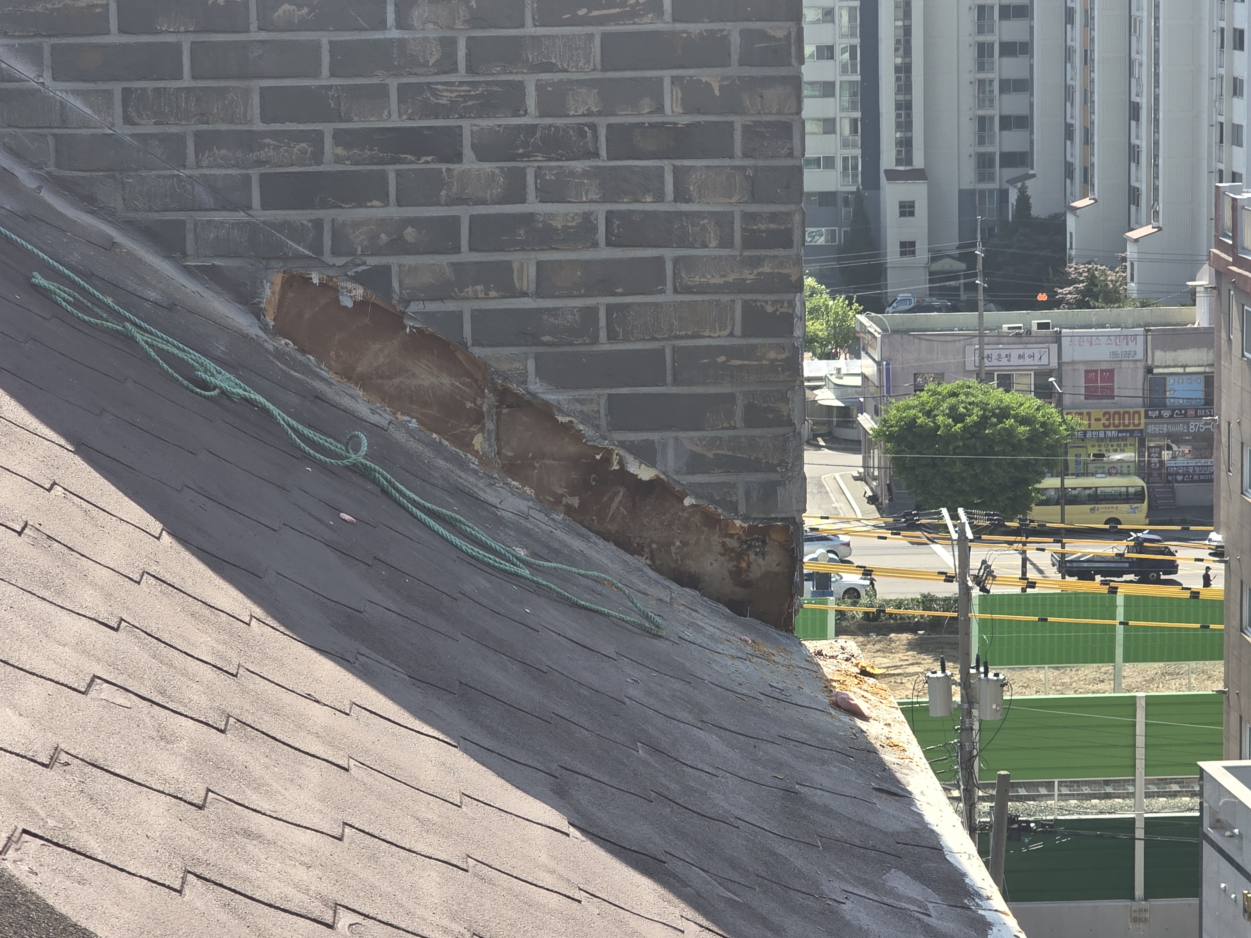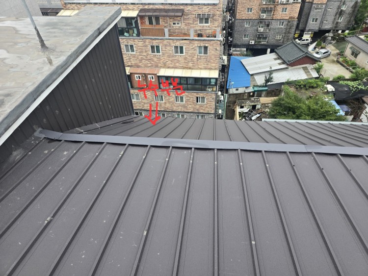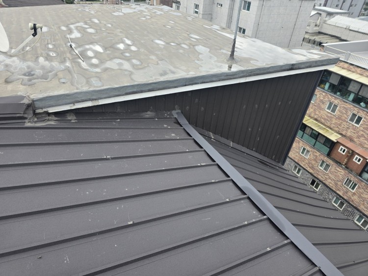지붕공사를 시행한 업체에서는 평평한 지붕부분에대한 추가시공이 필요한고 같다고 하는데 사진에서 보시다시피 해당부분도 일전에 방수포로 작업을 하였고 작업후에도 똑같이 별반 달라진게 없었습니다. 여기에 경사를줘서 강판작업을 하는게 맞는지 기존 칼라강판작업이 문제인지  아니면 다른곳이 문제인지.. 도통 알수가 없어 도움을 얻고자 다시 글을 올립니다.
