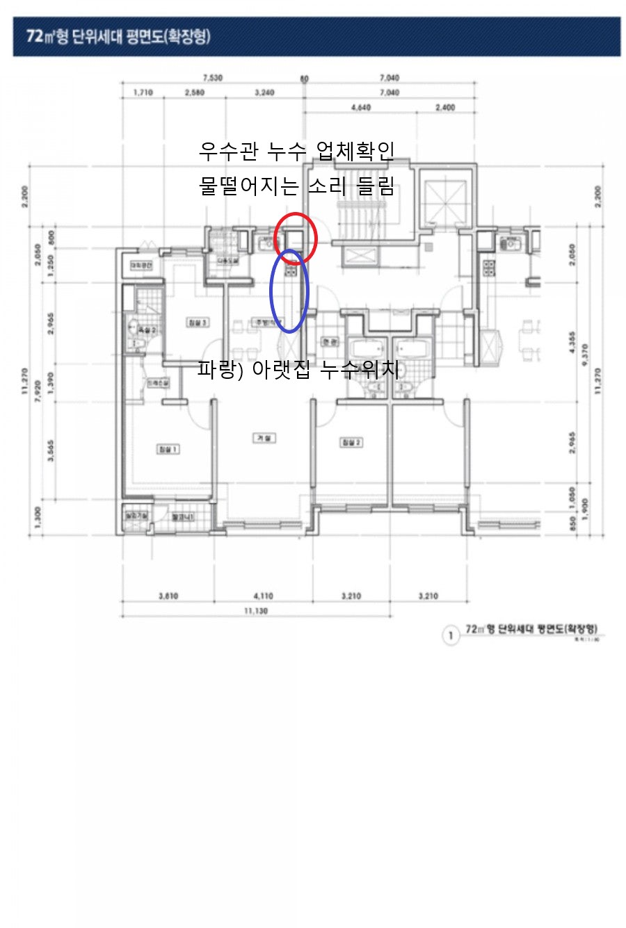 아래 평면도 사진을 첨부하면서 설명을 드리면, 업체가 확인한 누수와 아랫집 누수가 바로 인접해 있고