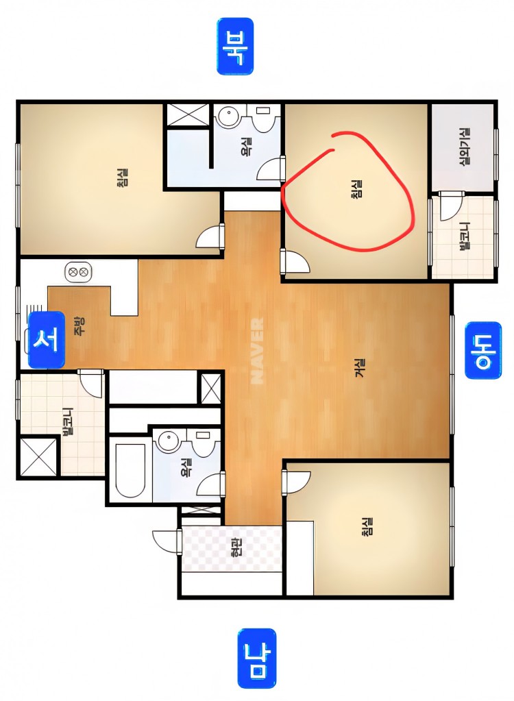 참고 사진과 같이 동향에 접해있는 면이 침실1, 거실, 침실3 인데요.
