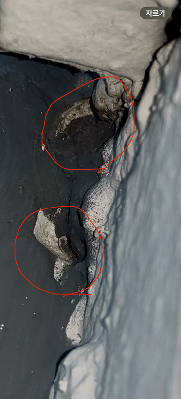 틈이 생겨 물이 빠져나오는 양이 늘었는지 물방울이 떨어지고 있구요,