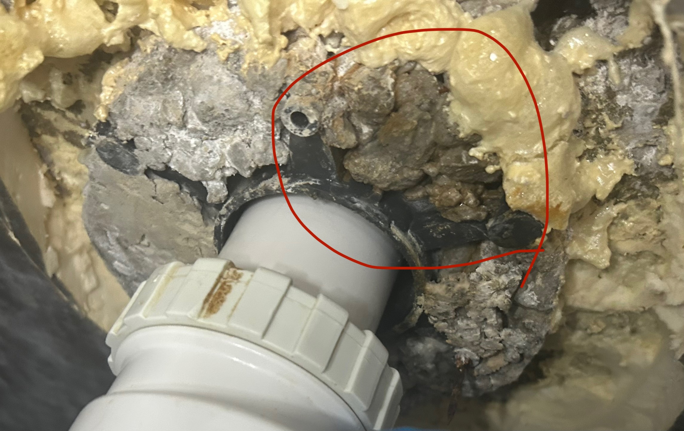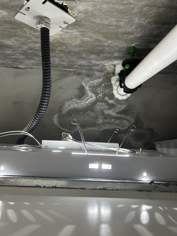 8월 30일에 누수를 처음 발견하고 약 2주간 지켜봤는데, 그동안은 물기가 전혀 없었습니다. 그런데 이번 주 수요일 갑자기 배관 쪽에서 물기가 생기는 걸 발견했습니다.  (사진에 동그라미친 부분입니다)