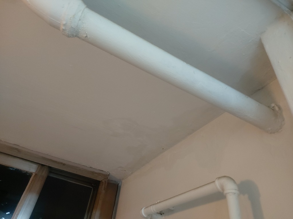 해당 배관이 무슨 용도일 지 감은 없으나, 배관의 천장 쪽 배관 주변의 얼룩은 상부층 해당 배관 주변을 통한 누수로 보입니다.