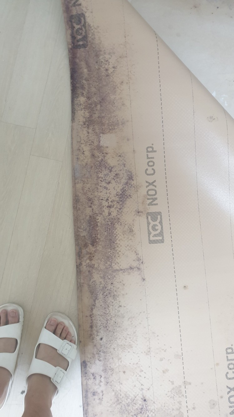 외벽 바로 아래 들춰보니 습기자국 발견되었고 장판 밑면에도 곰팡이 발생