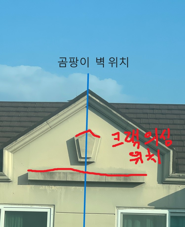 아마도 저 의장 키스톤같아 보이는부분에서 누수가 생길만해보여서 그쪽으로 물이 들어올 가능성이 가장 높지 않나 싶습니다
