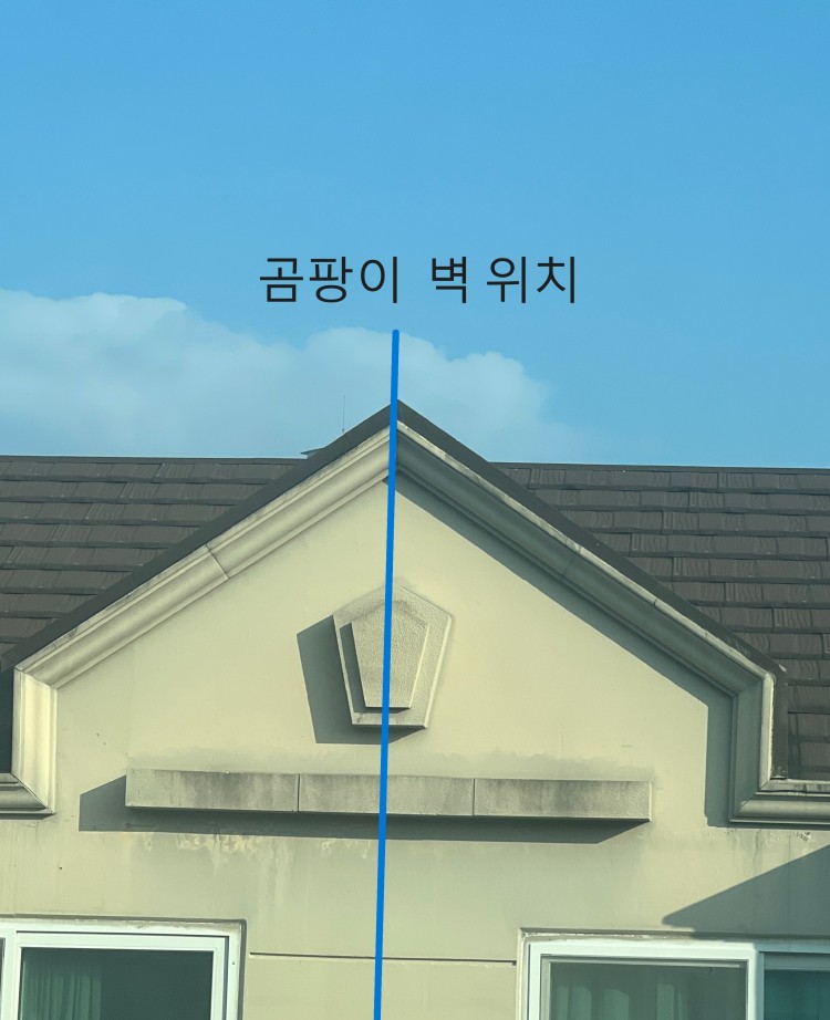 * 4번째 사진은 창문 밖으로 찍어본 곰팡이 핀 벽면 윗 부분입니다. 우레탄 방수 부분이 아니라 적갈색 판? 같은걸로 되어 있는 뾰족한 부분이랑 위치가 맞아보이네요..