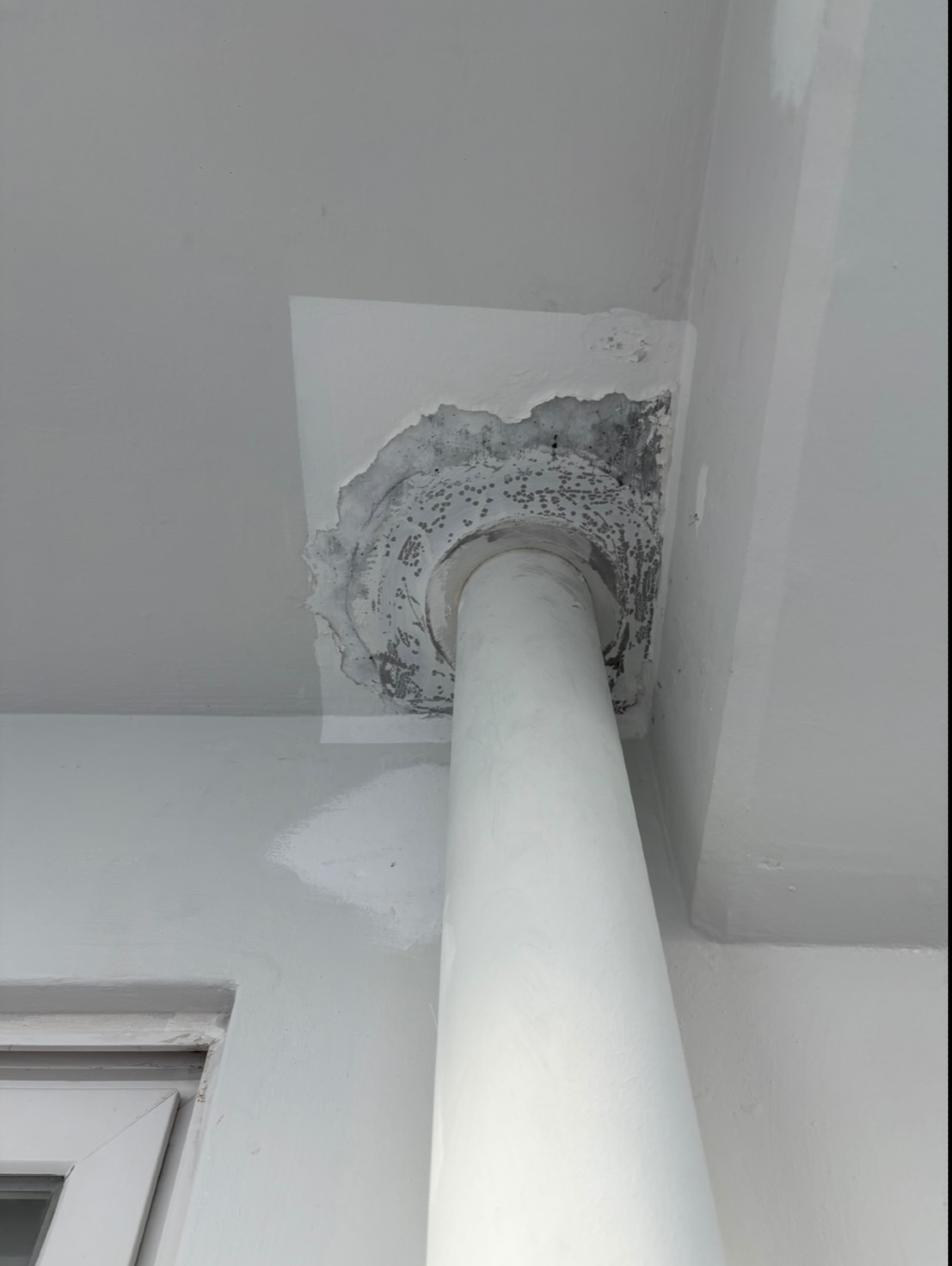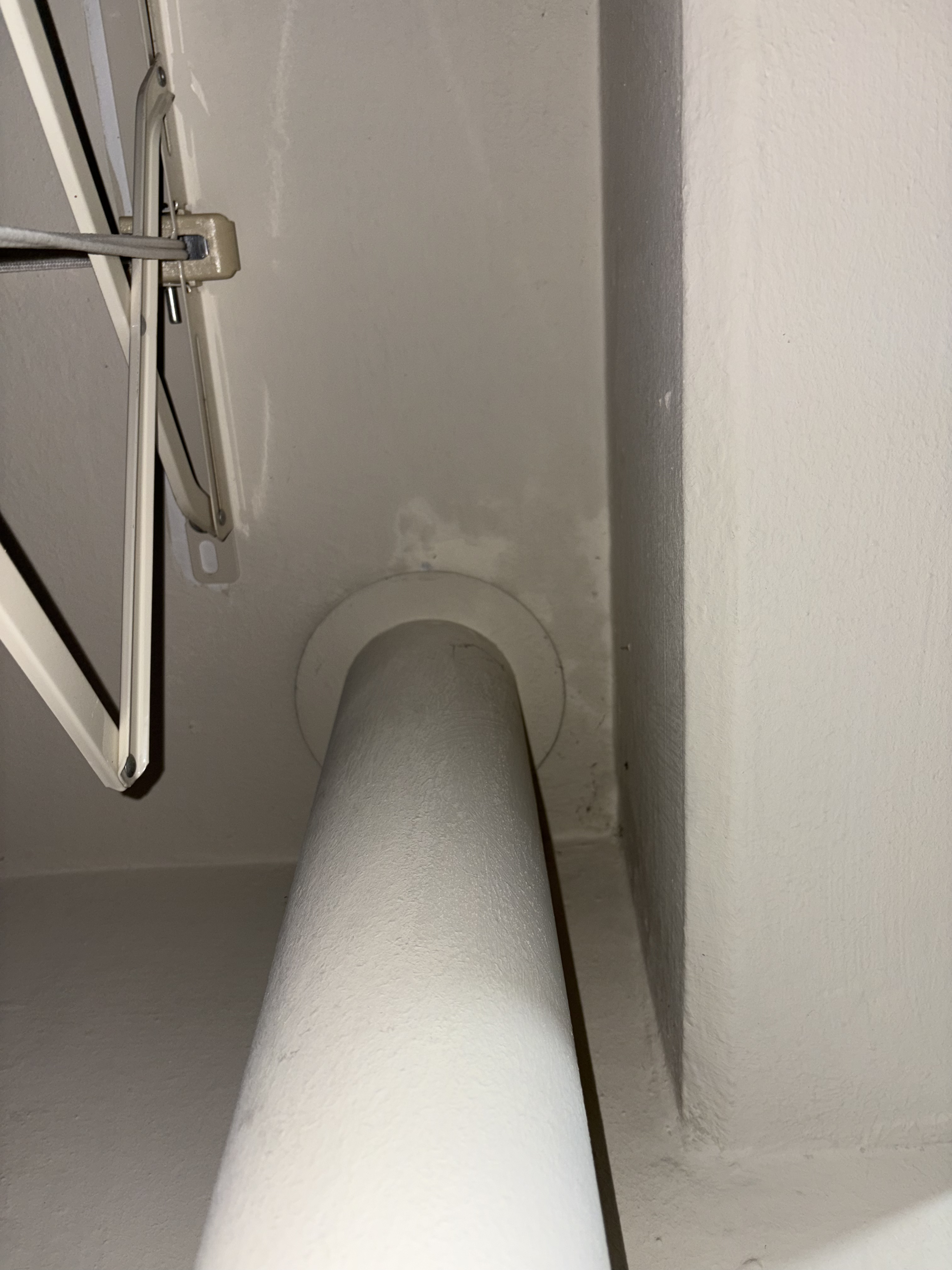 (2) 저희 세대는 발코니가 유성페인트로 마감되어 있어 위 첨부 파일에서 보시는 것처럼 우수관 천장 주변에 변색만 있는 상태입니다.