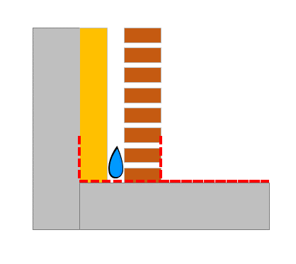 즉 아래 그림에서, 준공 모습은 왼쪽 그림처럼 "방수층이 조적의 표면"에 있는 것 처럼 보이는데...