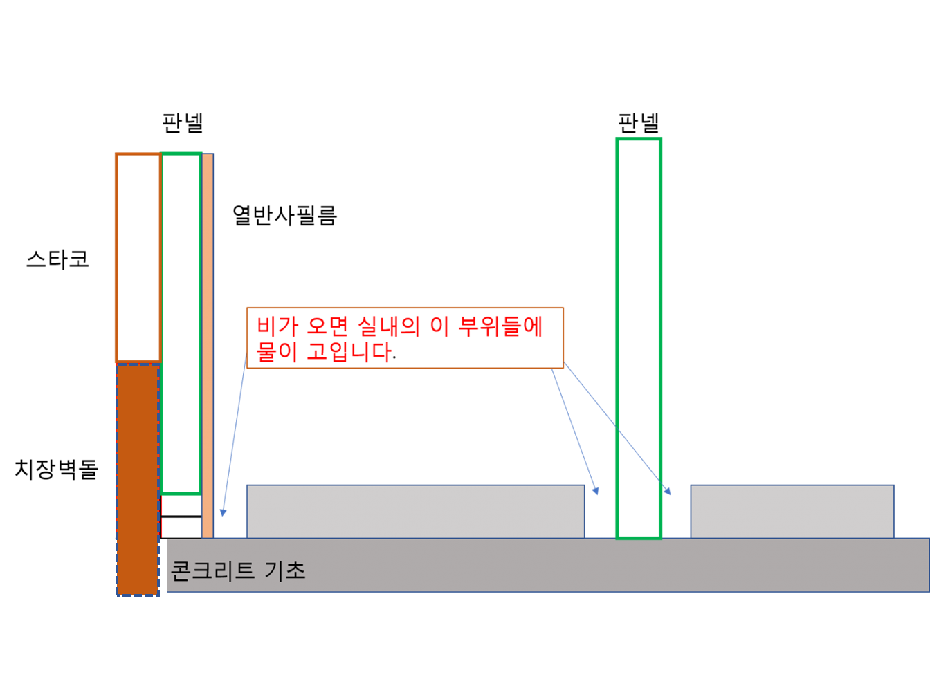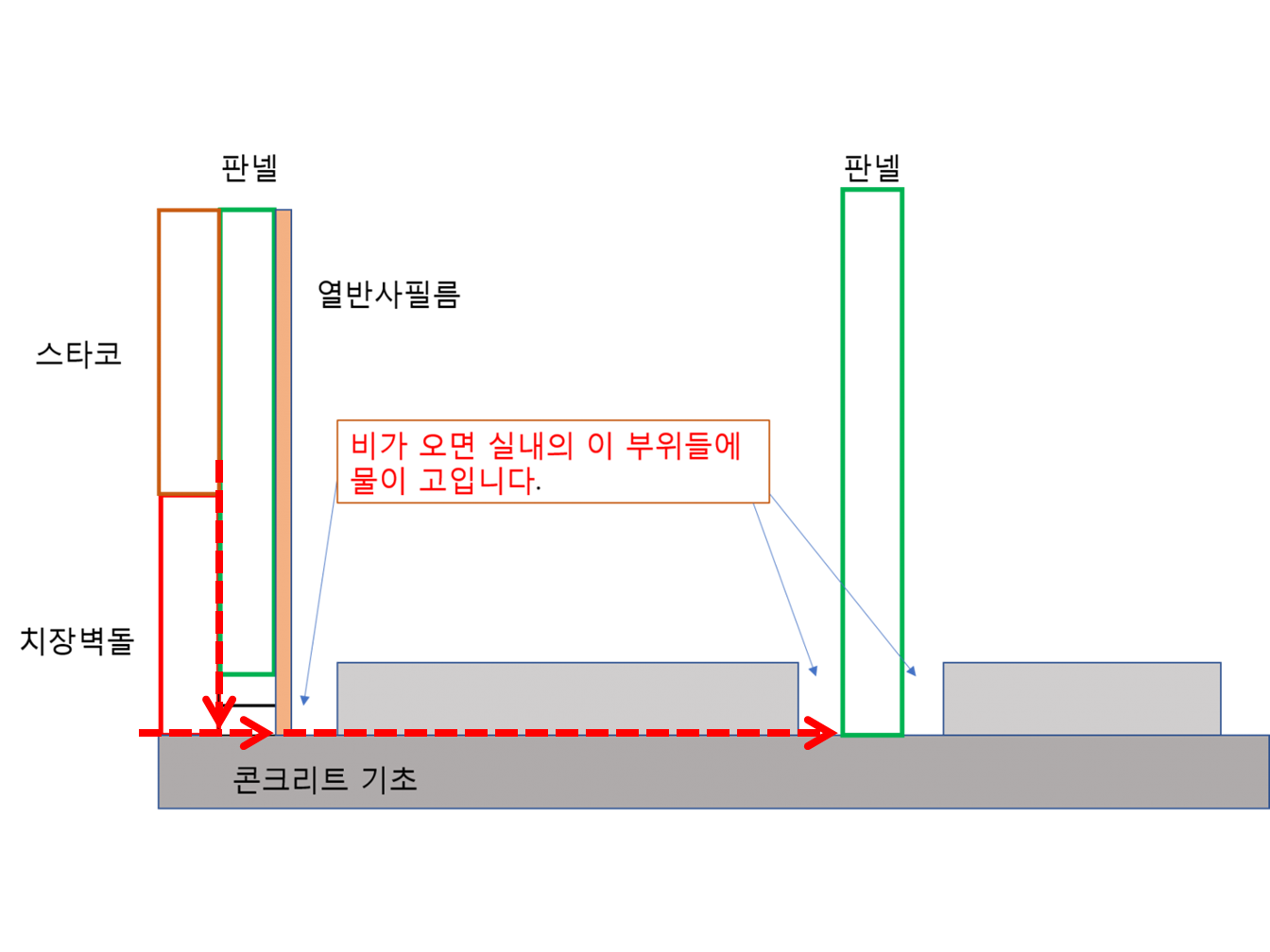 이 당시에 문제되는 석고 보드들을 제거해 놓은 상태여서, 비가올떄 살펴보니 콘크리트 기초와 판넬이 만나는 부위에서 물이 스며 들어오는 것 처럼 보였습니다.