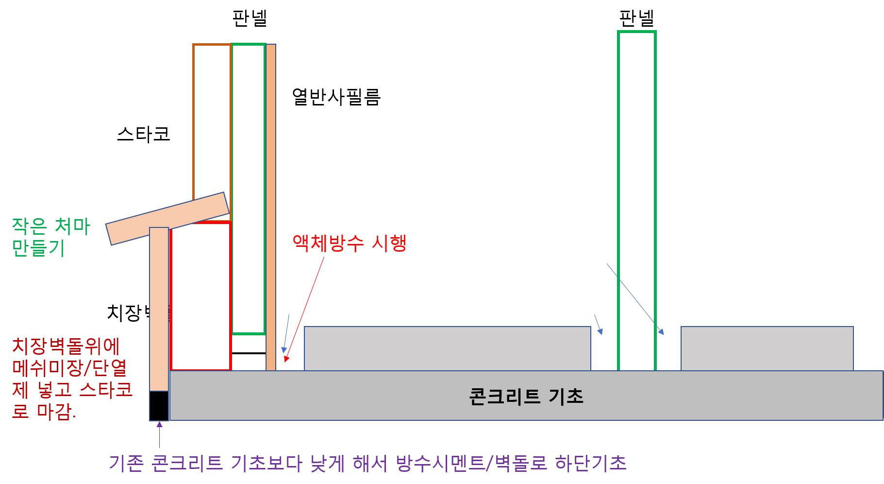 후면의 치장벽돌들을 제거해 내고 위의 스타코를 콘크리트 기초까지 연장하는 것으로 해결이 될까요?