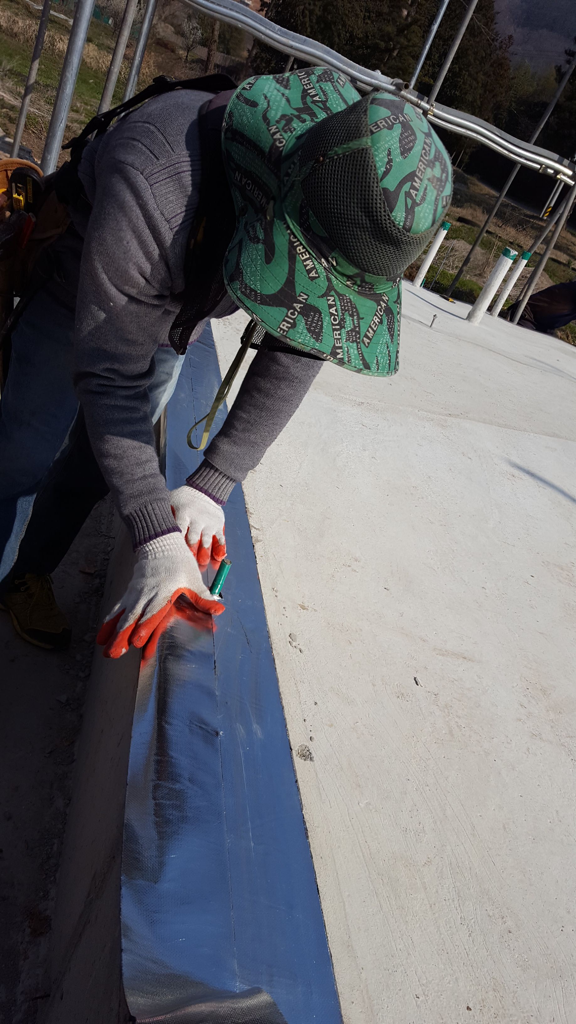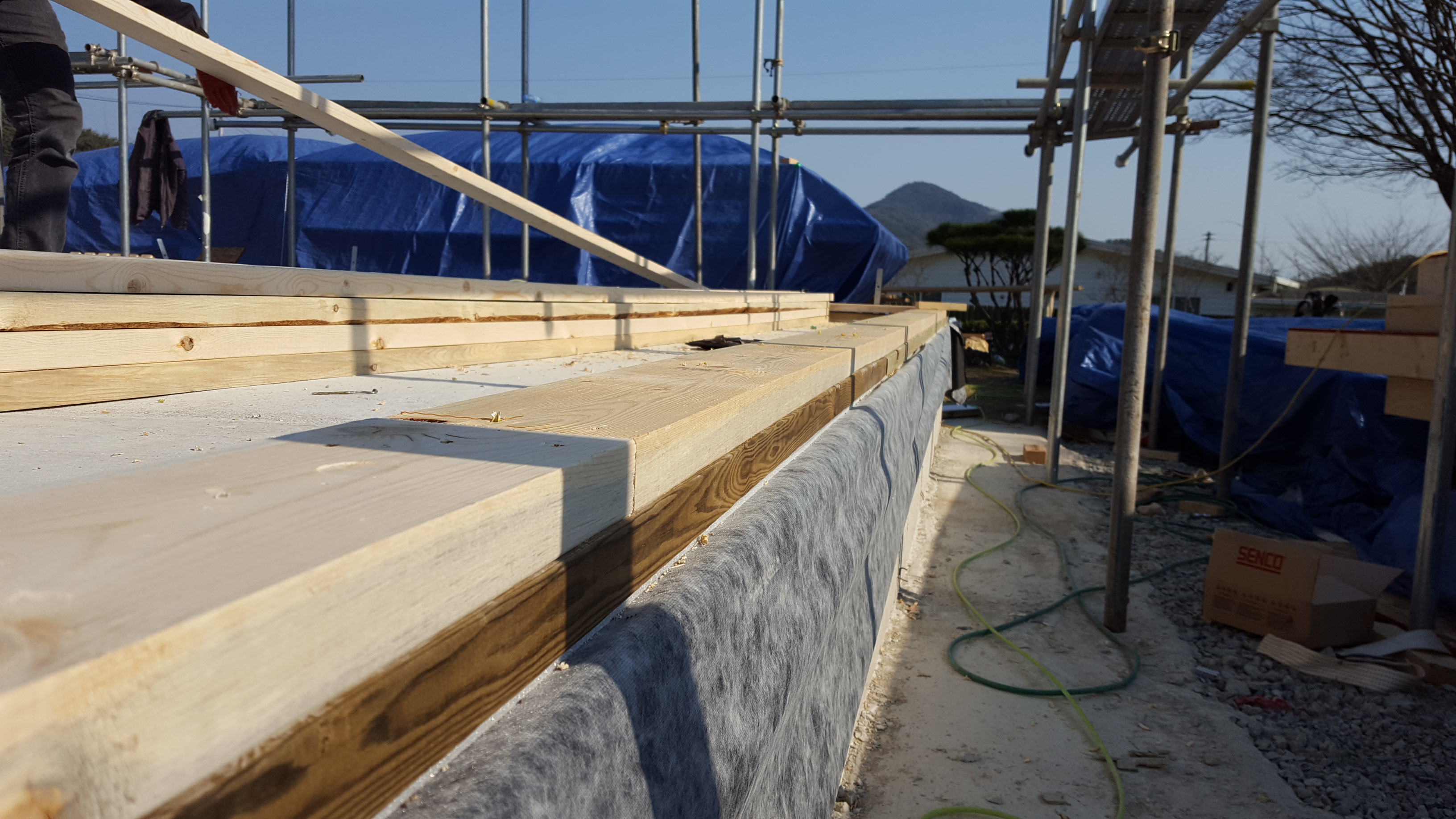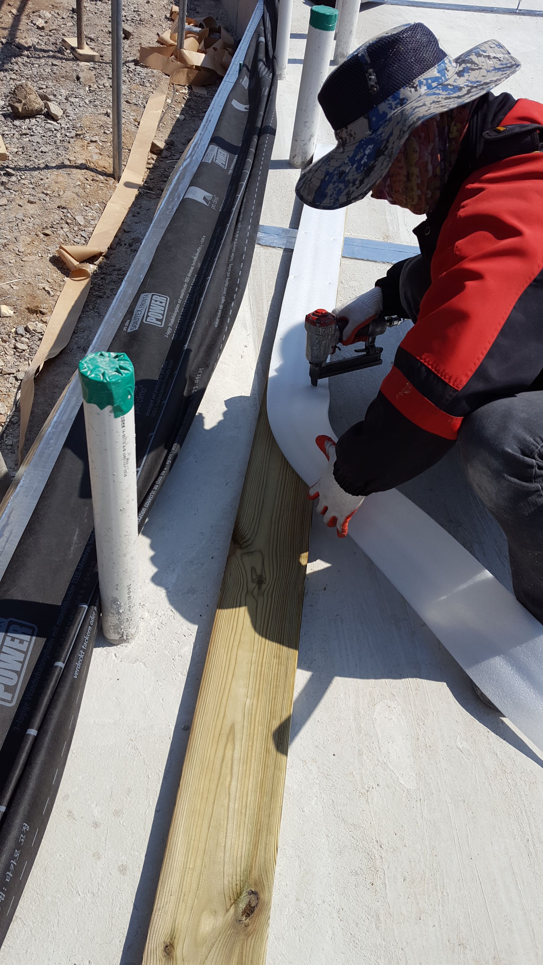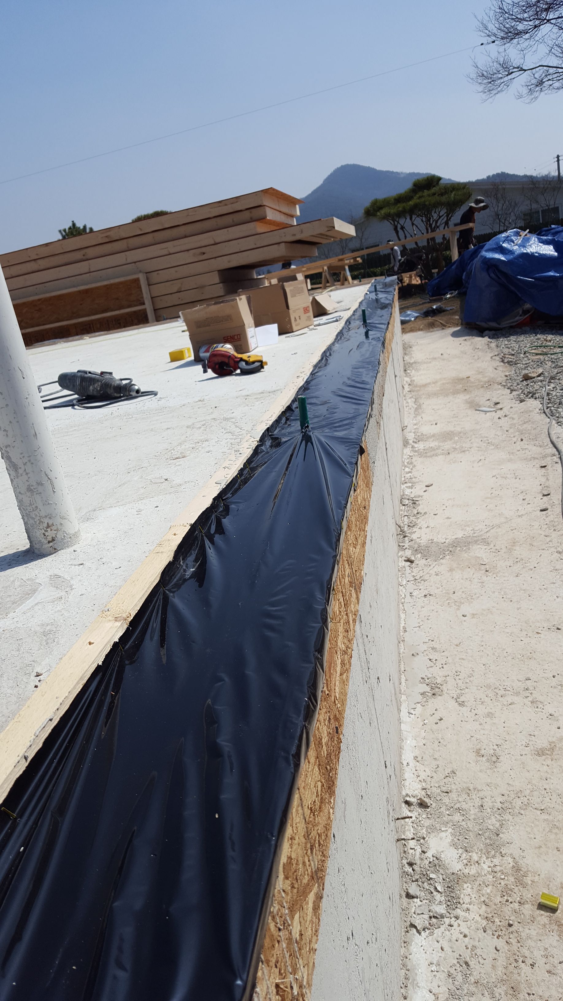 기초 측면과 토대목이 놓이는 자리만 시트를 붙이구요, 나머지 부분은 바닥 단열재 깔기 직전에 이어 붙입니다.