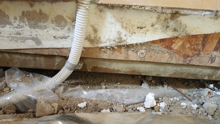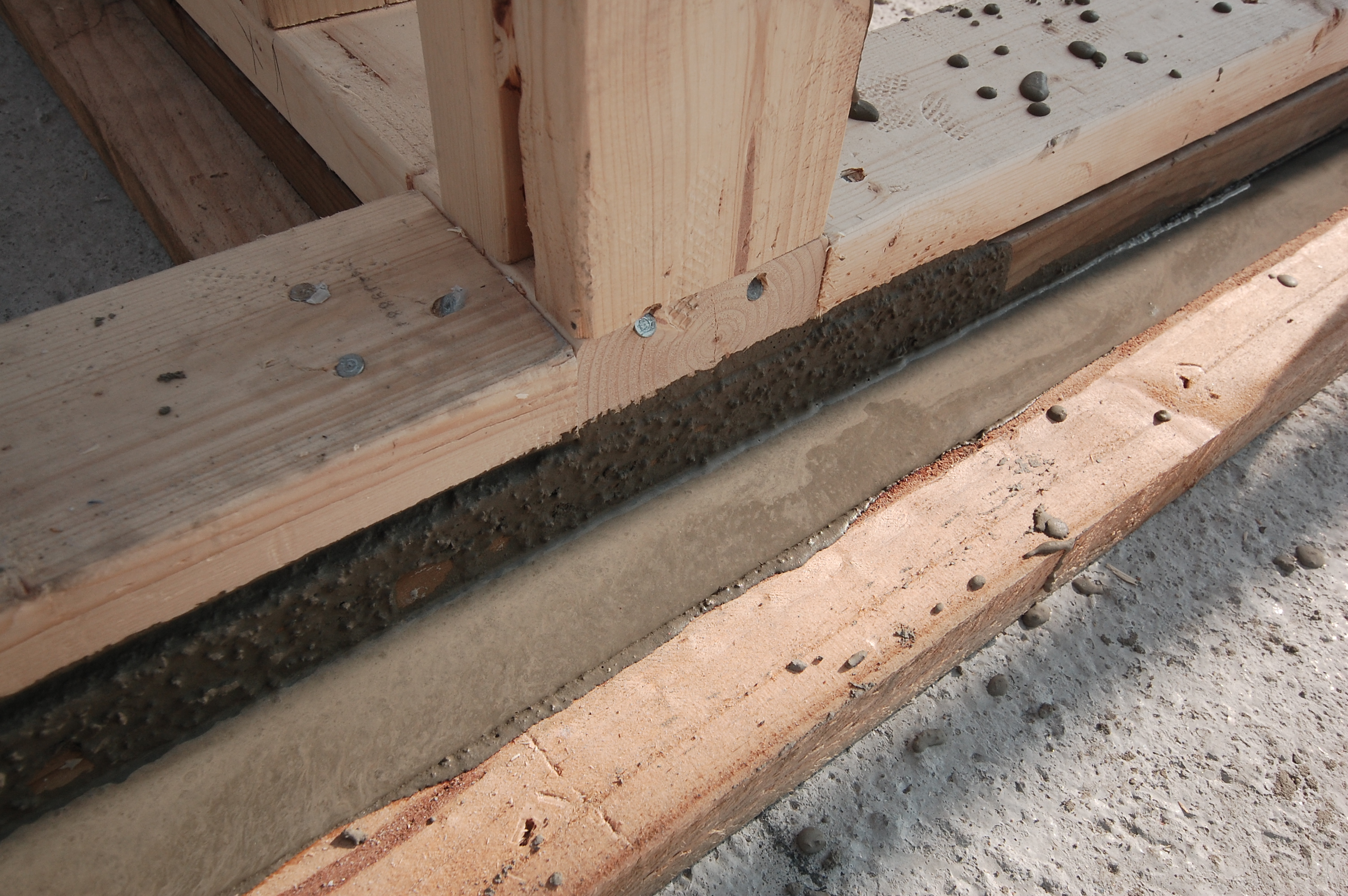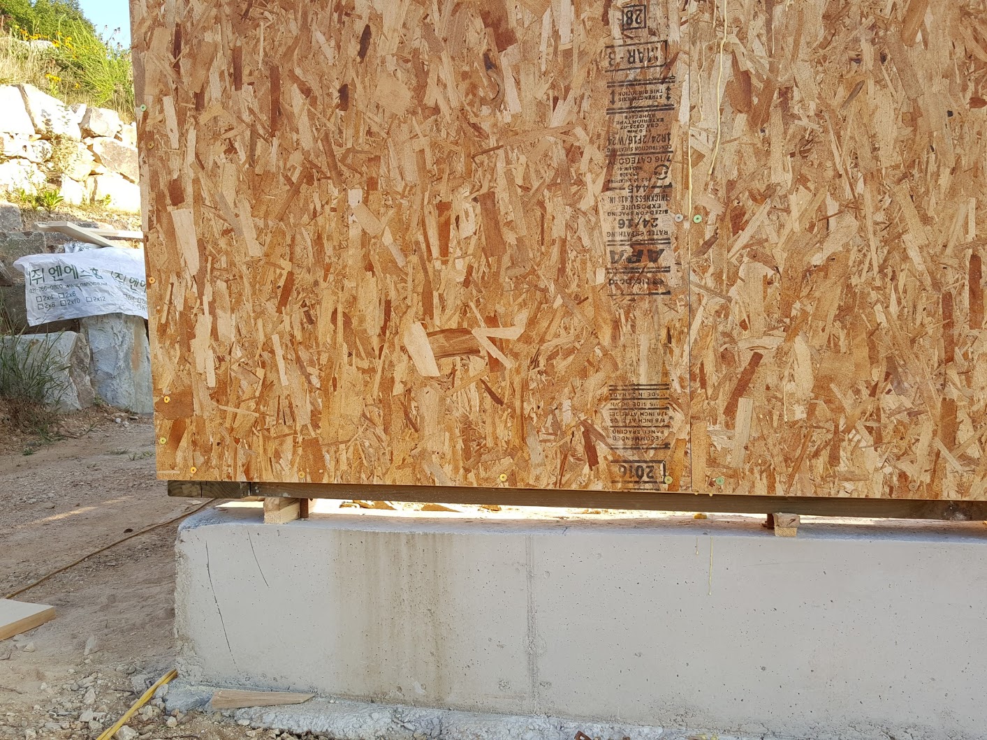 안녕하세요? 저는 패시브하우스를 지은 건축주입니다. 매트기초위에 SIP판을 세워서 구조물을 만들고 단열을 하고 있는데 욕실 방수 하자가 있어서 욕실을 뜯고 보니 사진처럼 매트기초위에 SIP판넬을 세우기 위해 수평을 맞추고 매트기초와 판넬을 세우기 위한 방부목 사이에 간격이 생기니 나무 쐐기를 박고 몰탈로 간격을 채웠습니다.
