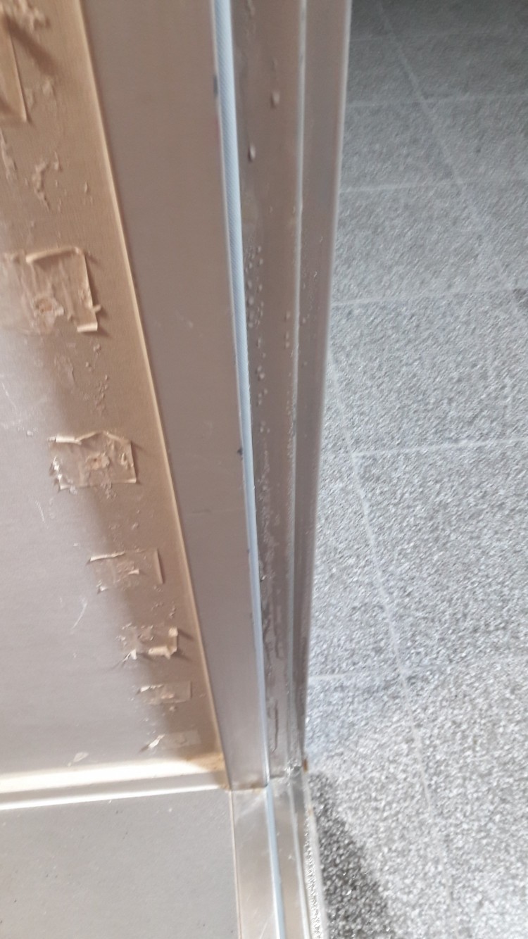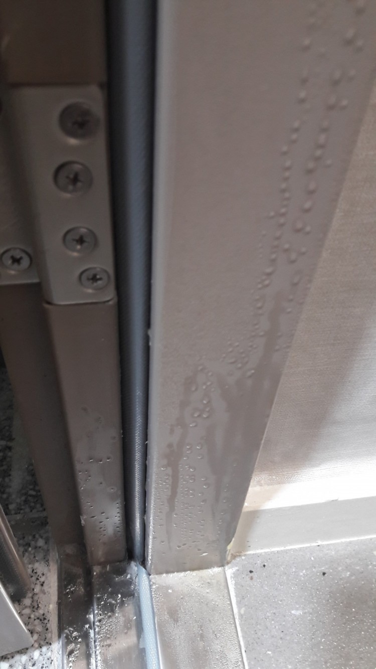 현관과 바닥이 맞닿는 현관문 하단부분에 항상 물맺힘이 생기고 왼쪽 하단 문틀 오른쪽 하단 문틀 도어락 주변 결로 발생합니다