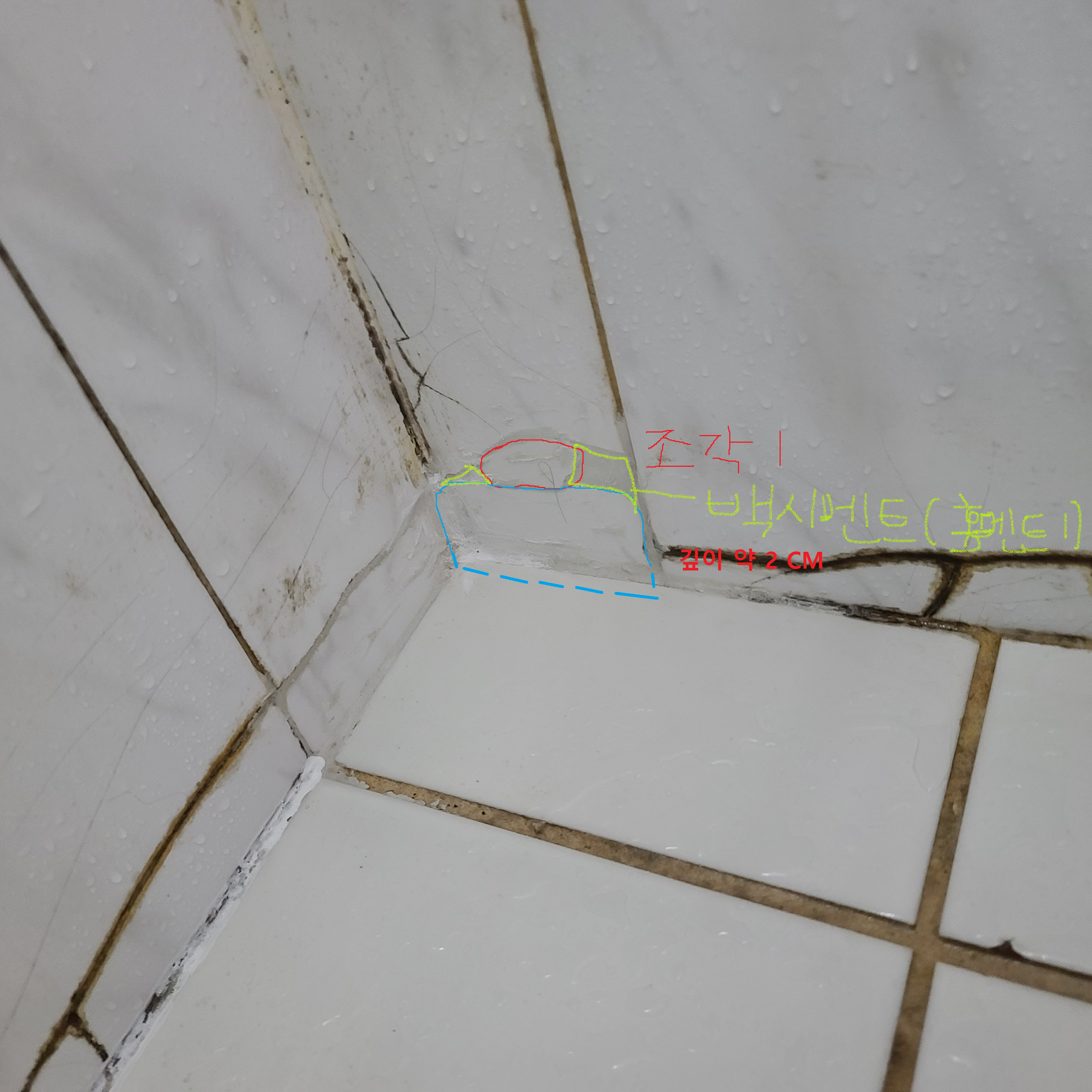 보시다시피 화장실 전체 사방이 다 타일 아래가 금이 가거나 깨졌습니다. 깨 보니 [타이벡 - 시멘트보드 - 타일본드 - 타일] 의 순으로 시공되어 있었습니다. 타일본드가 딱딱하지 않고 죽처럼 변했습니다. 심한 곳은 70~80% 나 죽으로 변했습니다. 떼어내기가 쉬웠습니다. 검은 색 실 같은 곰팡이류가 피어 있었습니다. 한칸 위의 타일을 깨어보니 본드가 제역할을 하는 부분은 떼어내기가 쉽지 않았습니다. 본드가 죽처럼 변한 곳은 떼어내기가 쉬웠습니다.