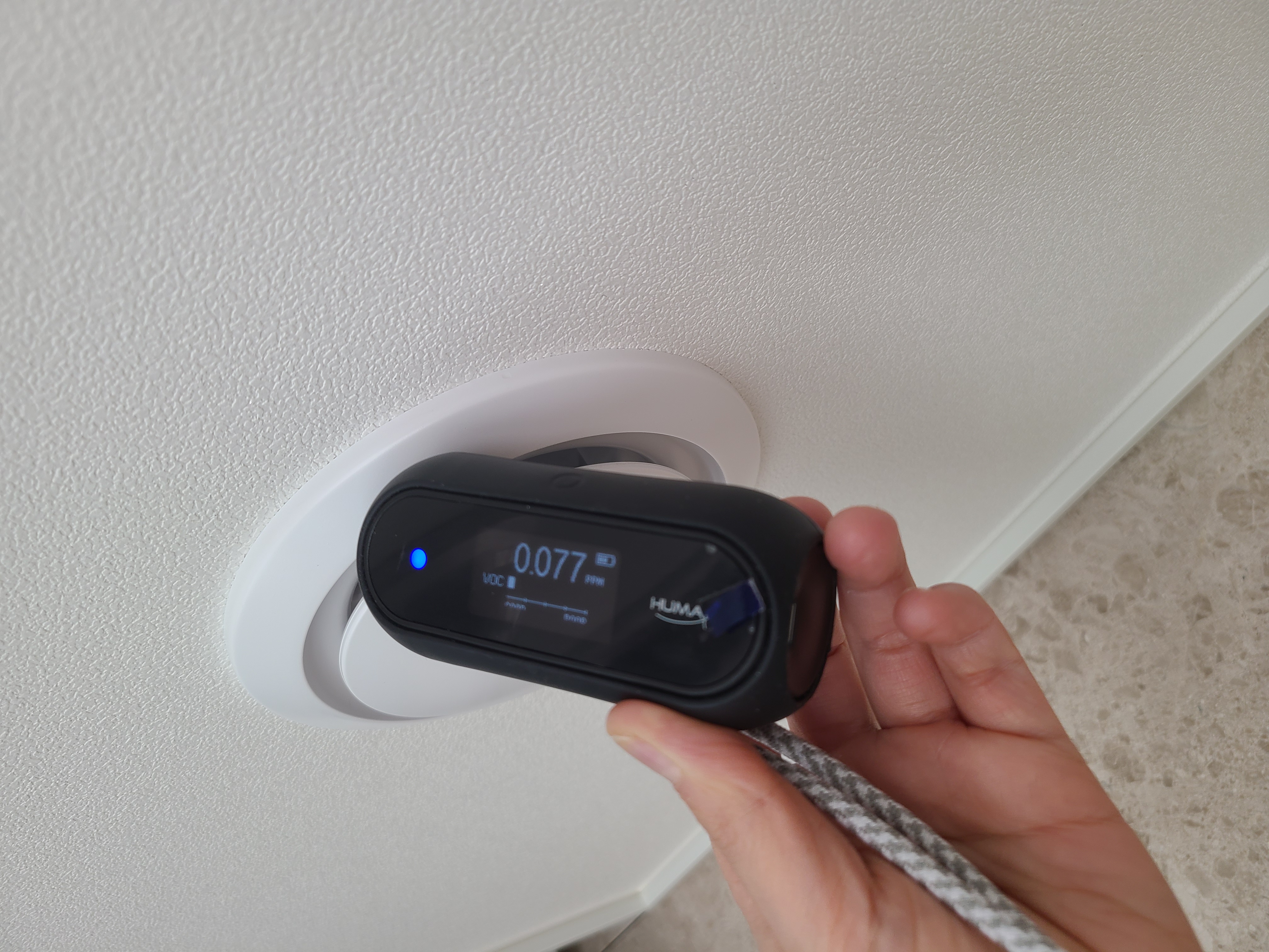 실내 천장의 급기구(바람이 나오는 구멍)에 측정기를 대어 보았을 때, 수치가 올라가면.. 전열교환기를 통해서 외부의 냄새가 들어오는 것이 맞고,