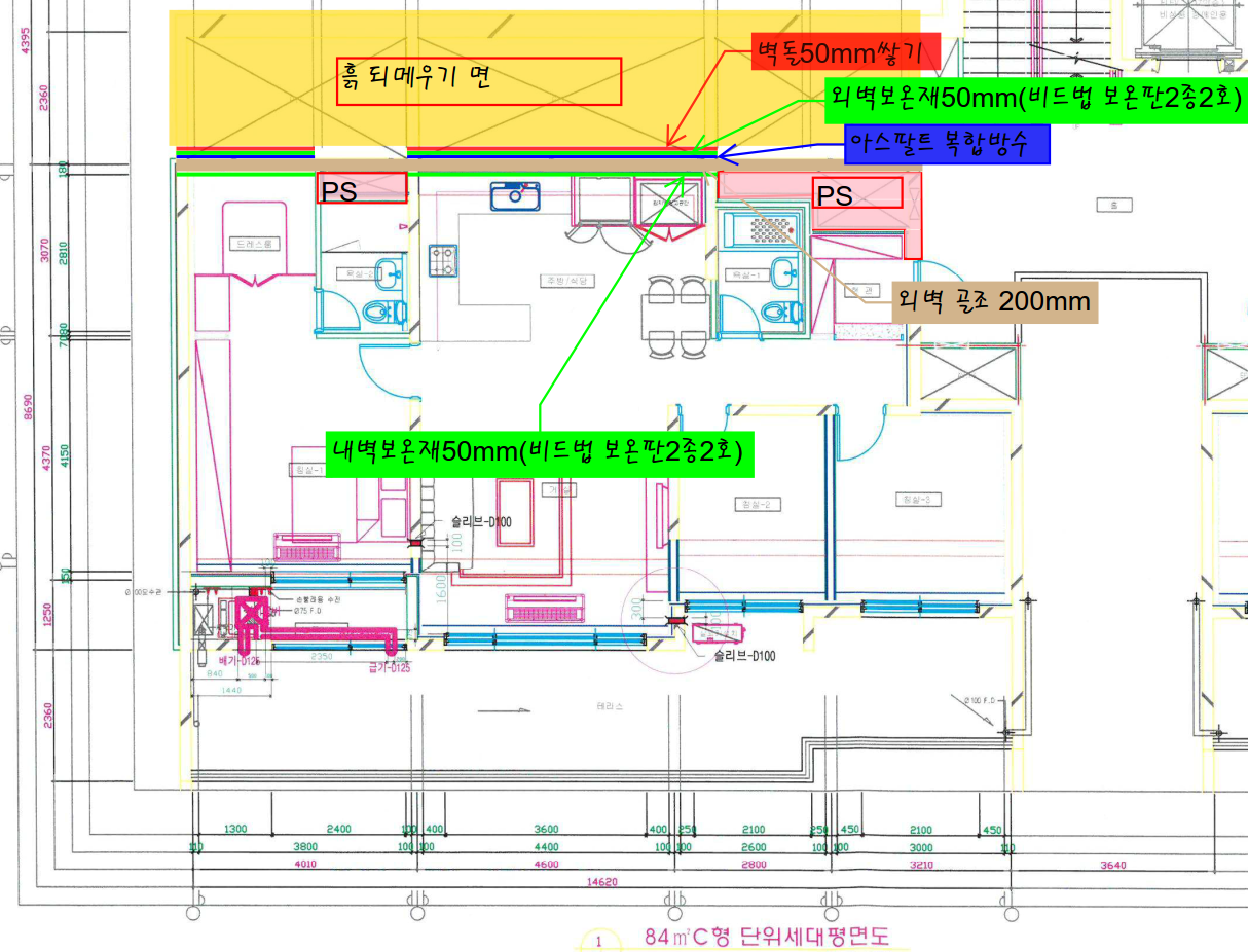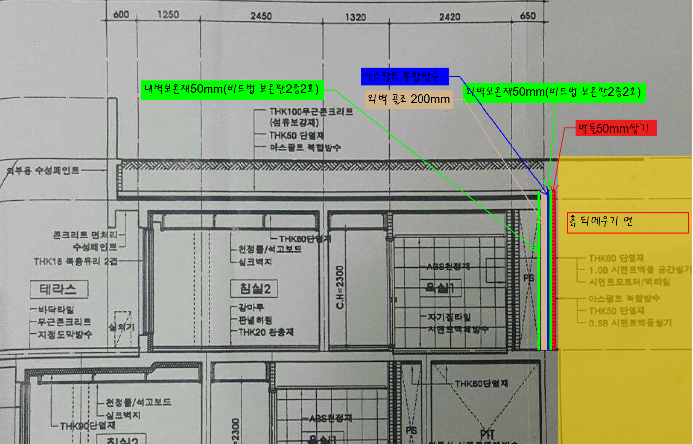- 실내보온재50mm(비드법 보온판2종2호) // 외벽 골조 200mm // 아스팔트 복합방수 + 외벽보온재50mm(비드법 보온판2종2호) + 벽돌50mm쌓기