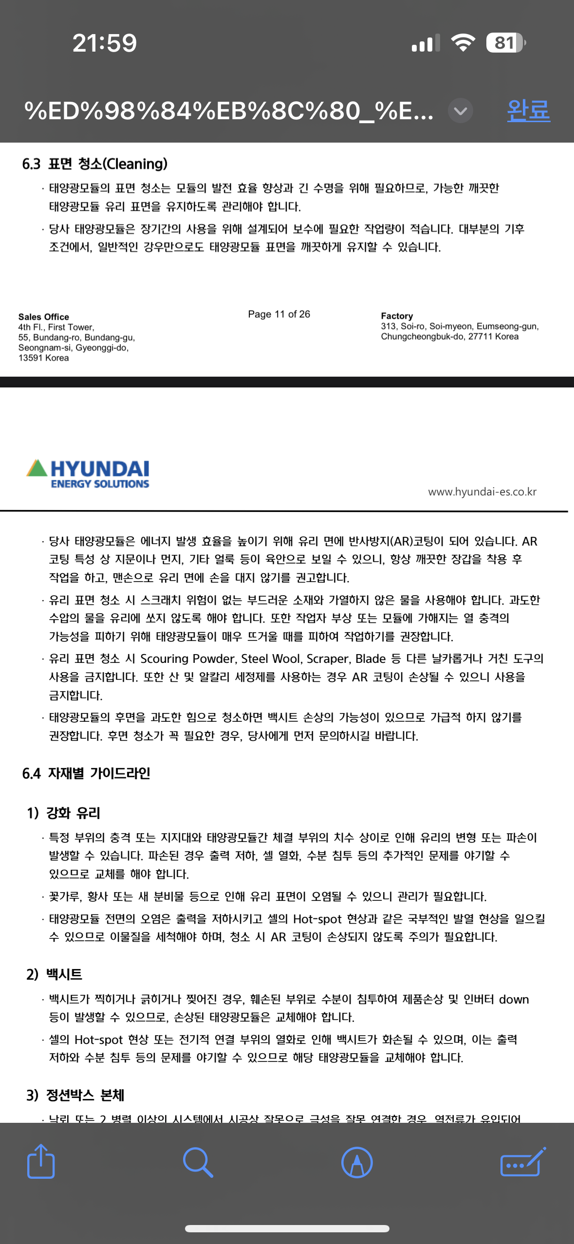 그러나 최근 출시되는 태양광 모듈은 15도 이상의 기울기로 설치된 경우 청소를 권장하지 않는 경우가 있습니다