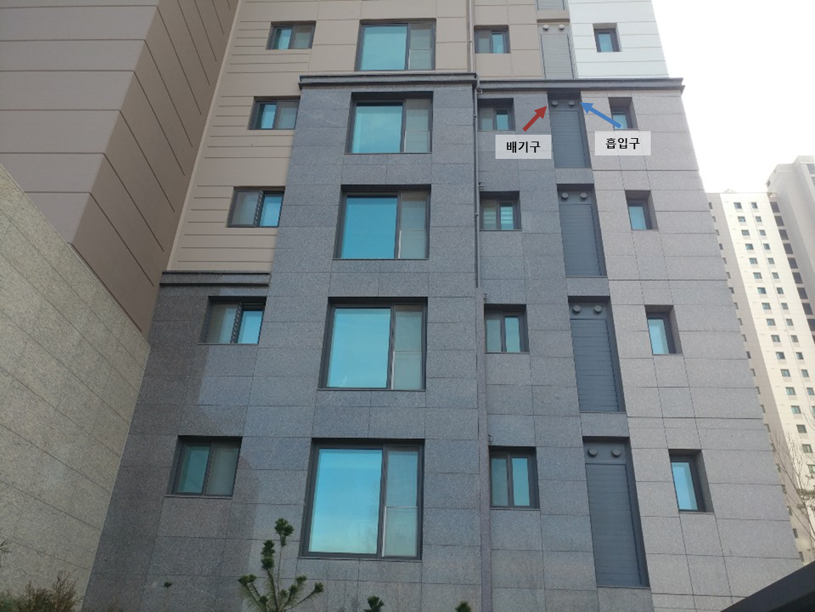 상대적으로 온도가 높은 공기가 빠져 나오는 배기구가 흡입구보다 위에 설치되면서 위치도 서로 상반되어야 한다는 게 현장실사 시 전문가들의 중론입니다. 혹은 배기구가 위로 향하고 급기구를 아래로 향하면 되지 않겠느냐고는 의견도 있습니다만, 그렇게 하면 주둥이를 위로 둔 형상의 배기구로 빗물이 들어갈 수 있기 때문에 적정하지 않다고 여겨집니다.