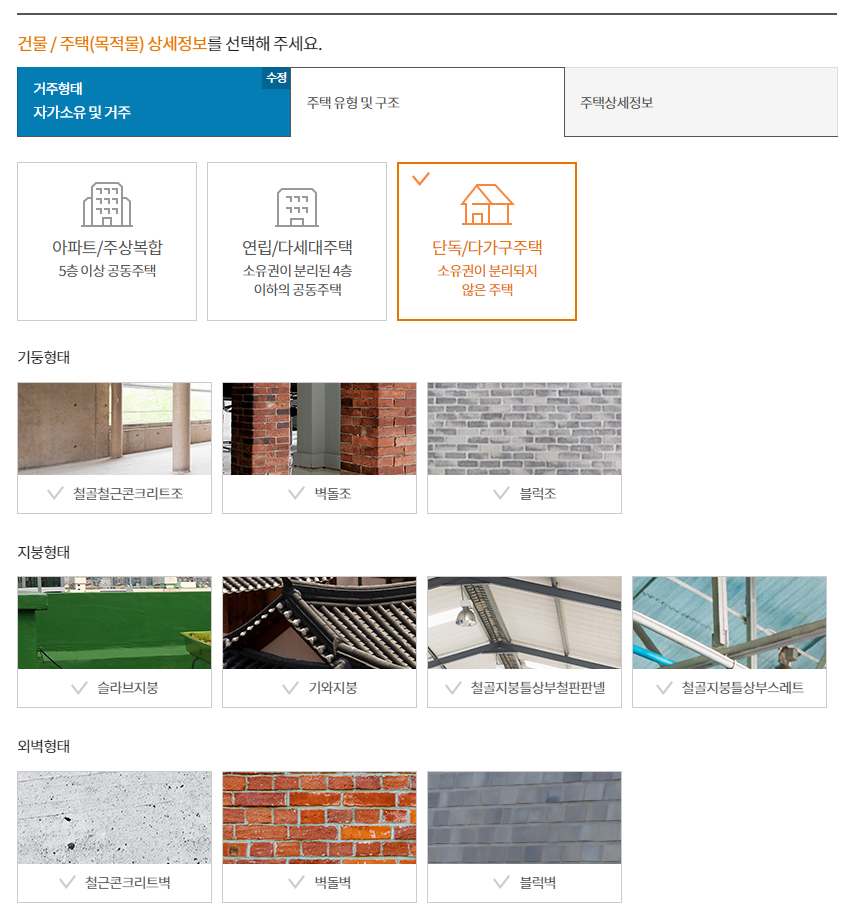 네, 감사합니다. H해상을 통해 보험을 알아보려 하니, 첨부 사진과 같이 기둥/지붕/외벽 형태에 대해 묻는데 이 부분도 알려주신다면 감사하겠습니다. (고민해 보니 모든 것에 해당되지 않을 수도 있겠다는 생각도 드네요?)