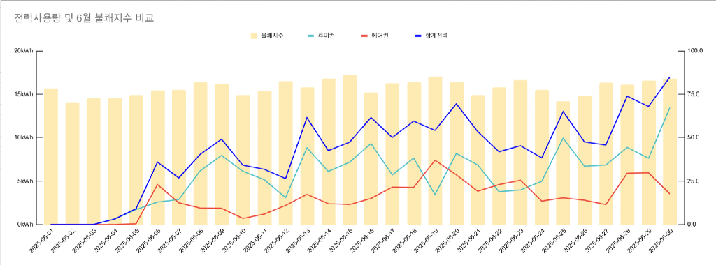 올해 여름에 휴미컨 + 시스템에어컨 교체 후 전력사용량을 기록중입니다