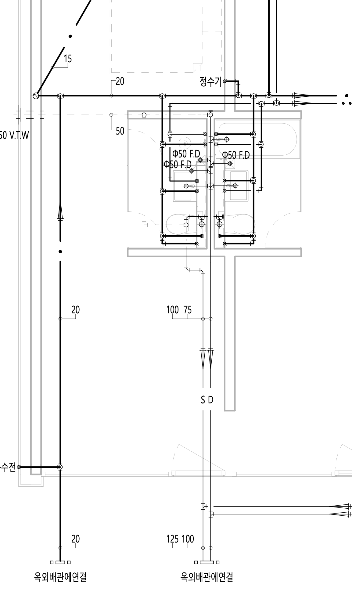 변경에 관한 논의는 전혀 없었습니다. 이 사진은 맨 끝단 외부로 나가는 배관인데 보시듯 90도로 두번 꺾여있습니다