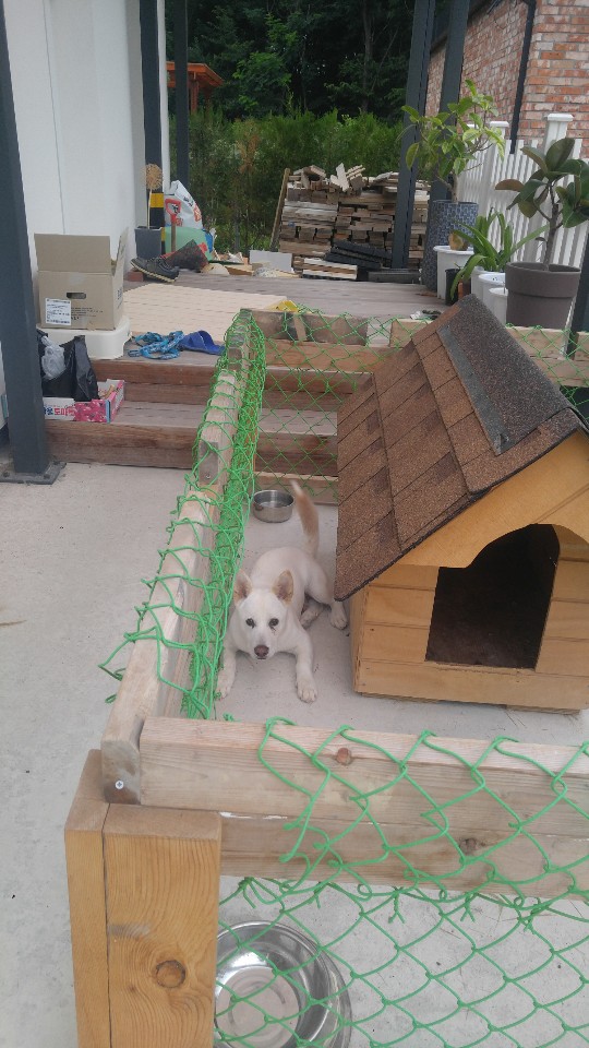 현재는 이렇게 살고 있습니다. 원룸형으로 이동식 개집...아니....강아지 집입니다.