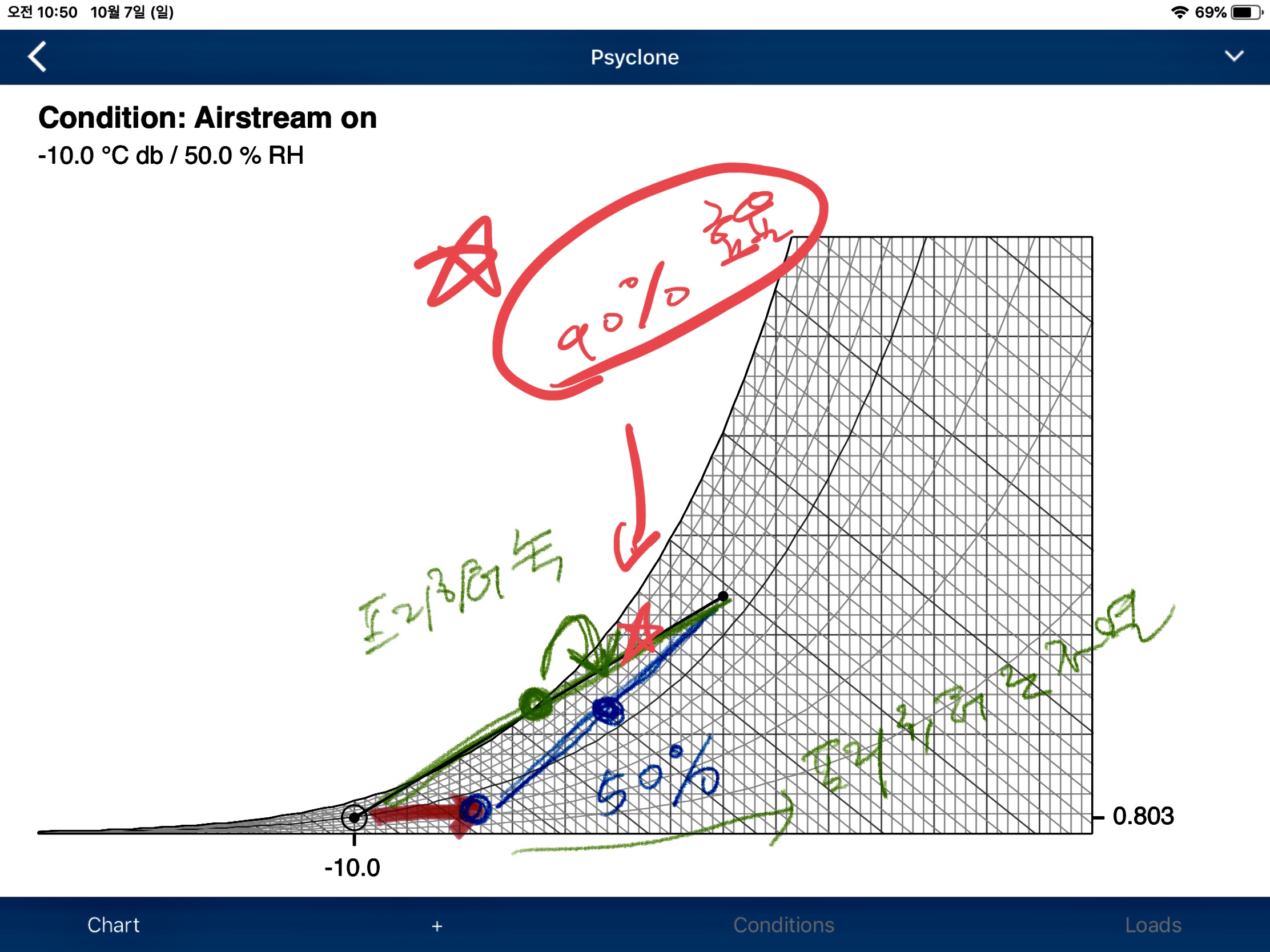 제가 90%, 50% 열교환기 효율을 설명하고져 했습니다. 90% 열교환기는 SA 가 결로 조건에 있질 않습니다. 그러나 50% 열교환기는 SA 가 열교환 후에도 결로 상태에 근접해있어 1. 다시 추가해야 할 난방 에너지 2.실내 습도에 영향을 미칠수 있는 위험성 . 이 두가지가 좋지 않다고 말씀드린겁니다.