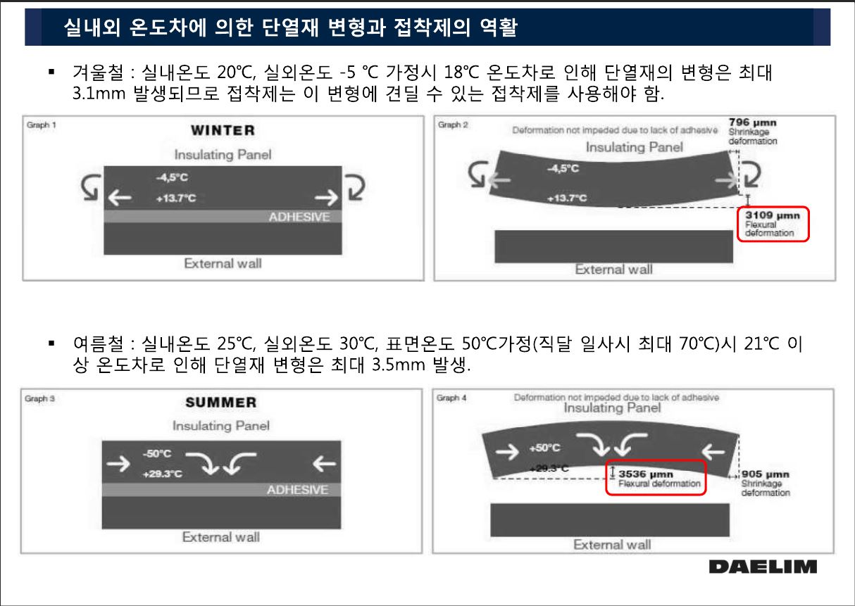 수축/팽창으로 인한 변형의 우려가 있으므로 단열재와 바탕면 사이의 접착제가 기준 이상 (KS 시험에 의한 0.8N/mm2) 이상의 성능이 있어야 한다는 의미이며, 그렇지 못해서 변형이 생긴 경우 하자로 보아야 한다는 뜻입니다.
