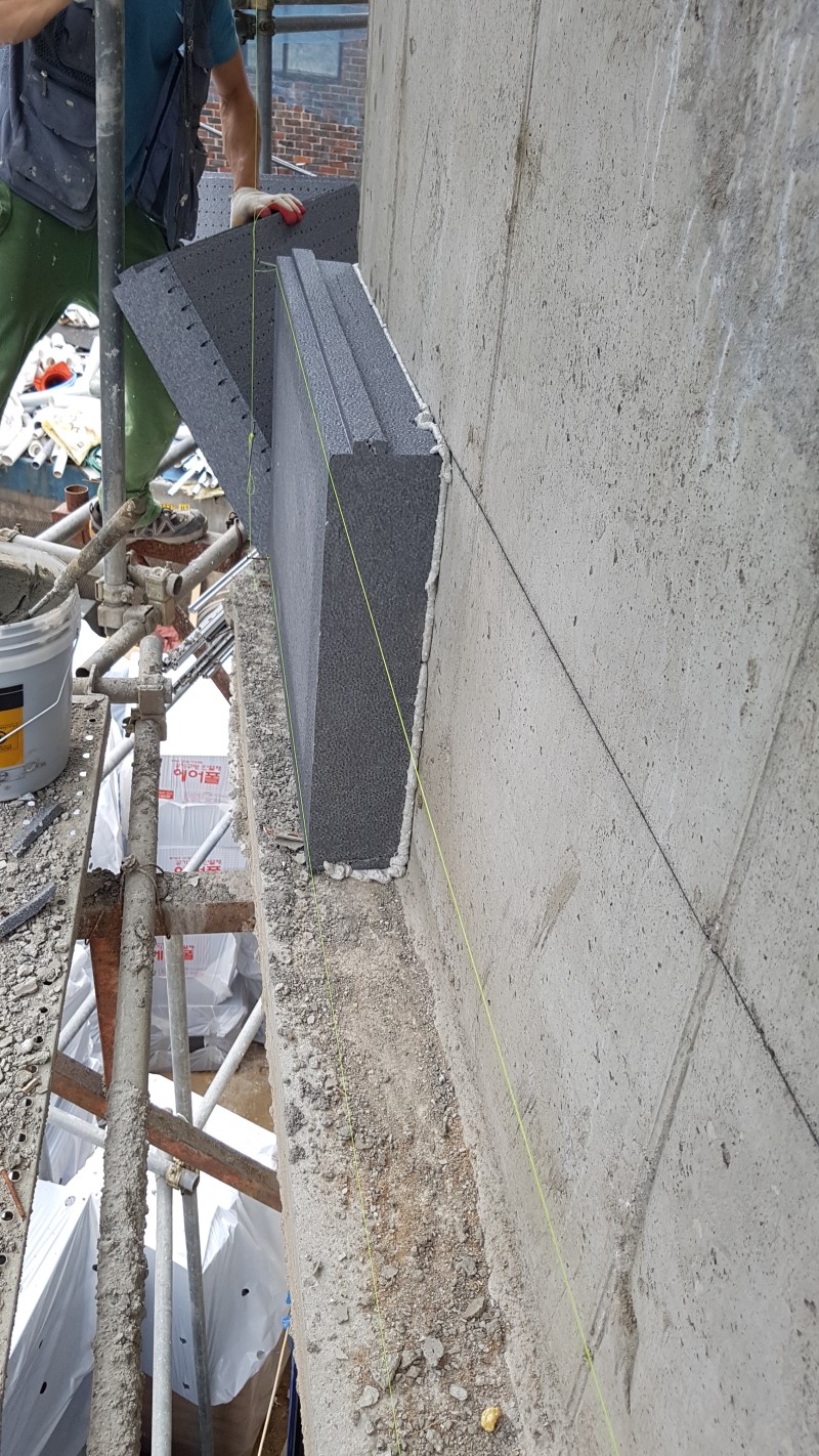 필로티부분은 접착몰탈 부착방식이며 단열재와 철근콘크리트사이 공격은 본딩폼 메꿈방식으로 작업진행하였습니다 또한 단열재 이음부에도 본딩폼처리.