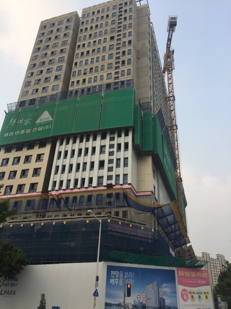 외부 공사용 지지대가 중간쯤에 걸쳐져 있기에