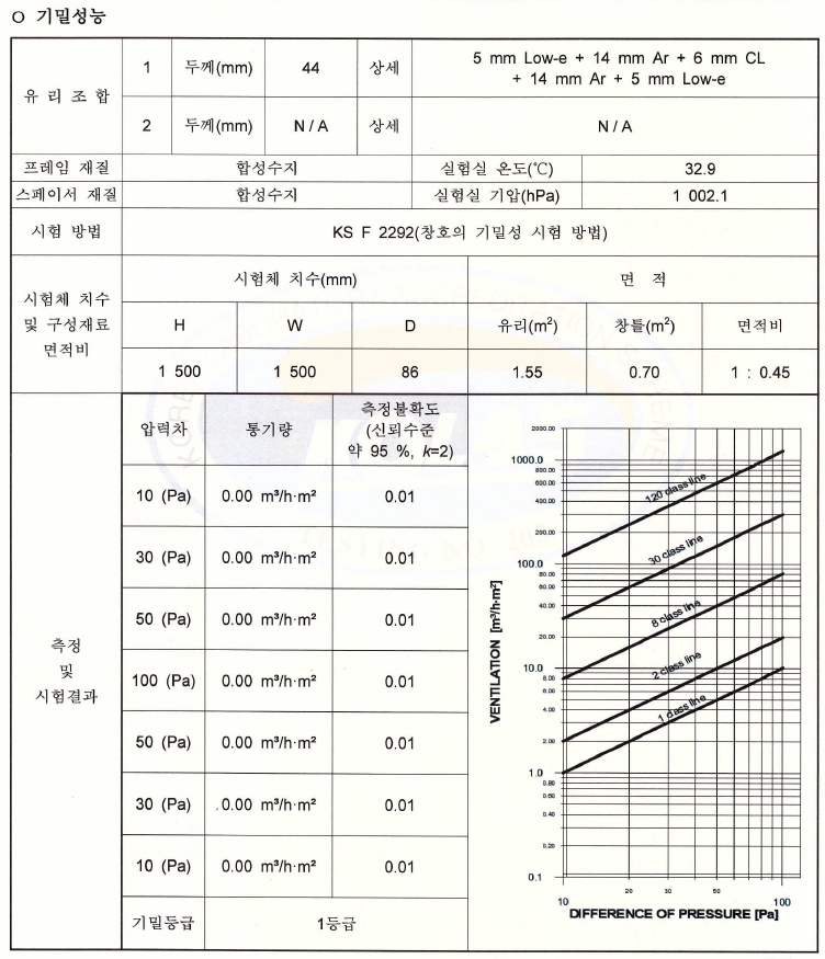 한 시스템 창호의 시험 성적서 중 기밀성능 부분 입니다.