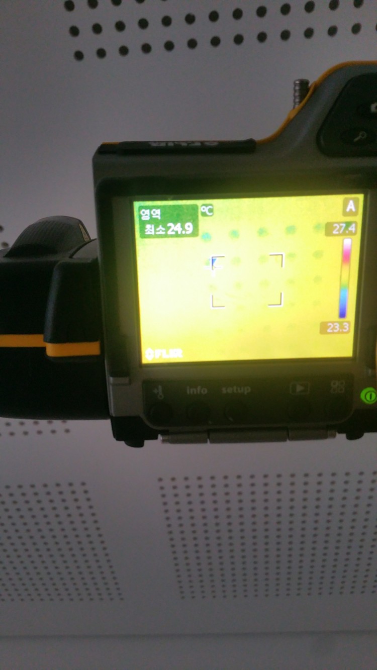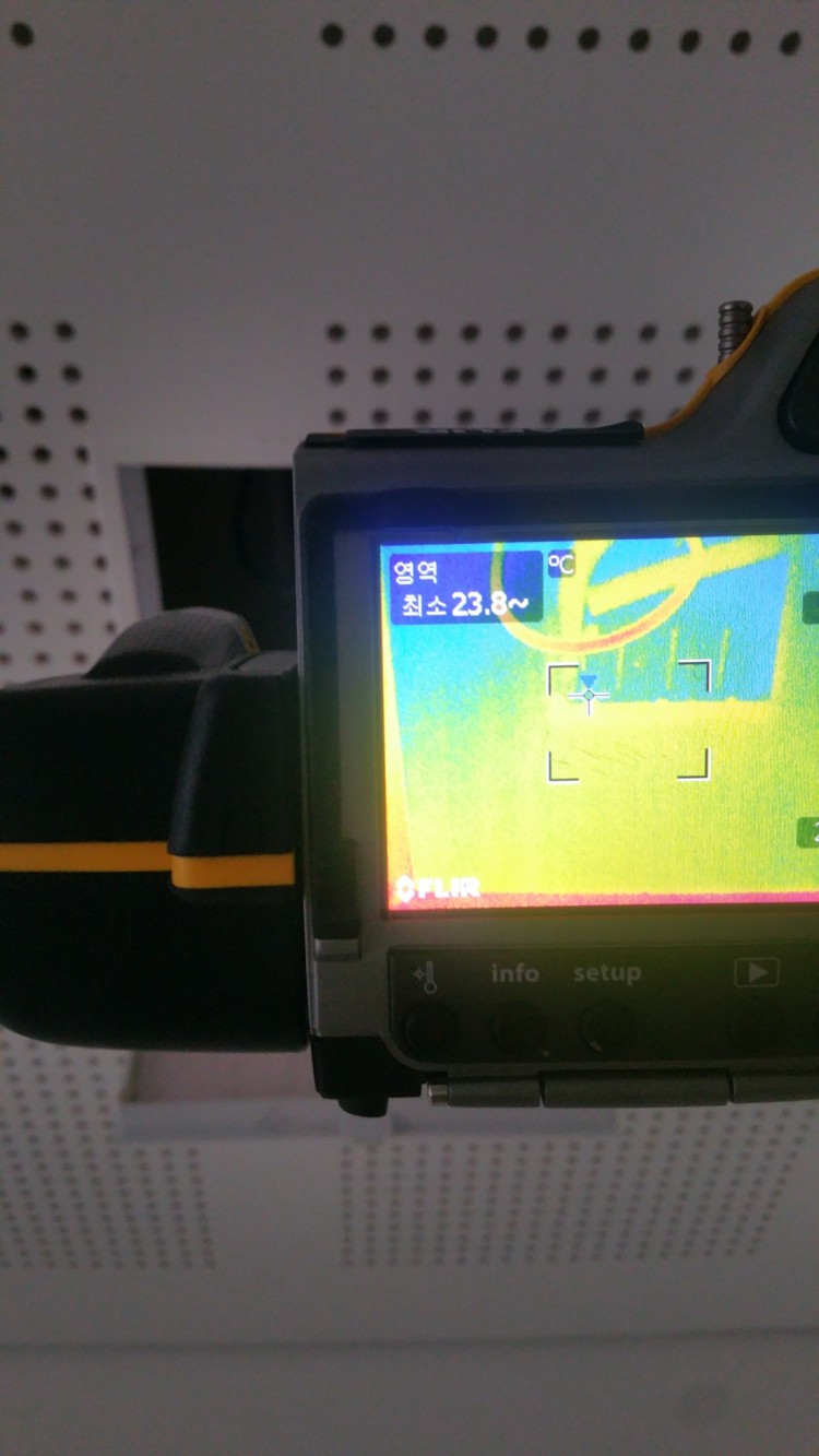 사진은 점검구를 열고 찍은 사진입니다. 최상층 천정의 온도인대도 불구하고 23.8도를 나타내고 있습니다. 금일 오후 5시경 찍은 사진입니다.