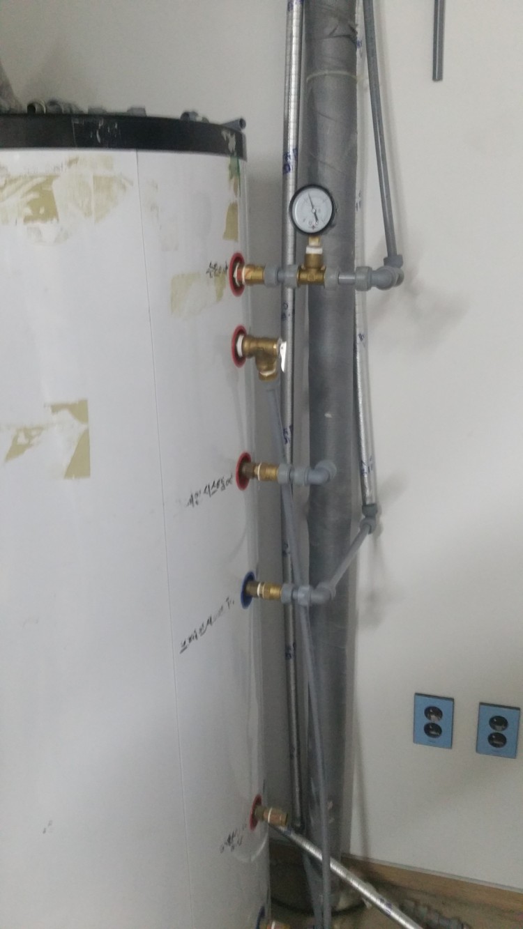 태양열 열교환기는 물콘이라는 기성용품에 덕트홉바를 주문하여 만들었습니다. 테스트해보고 기밀하지 못한 부위가 있으면 잘 메꾼후 ^^ 보온하기위해 아직 노출 상태입니다.