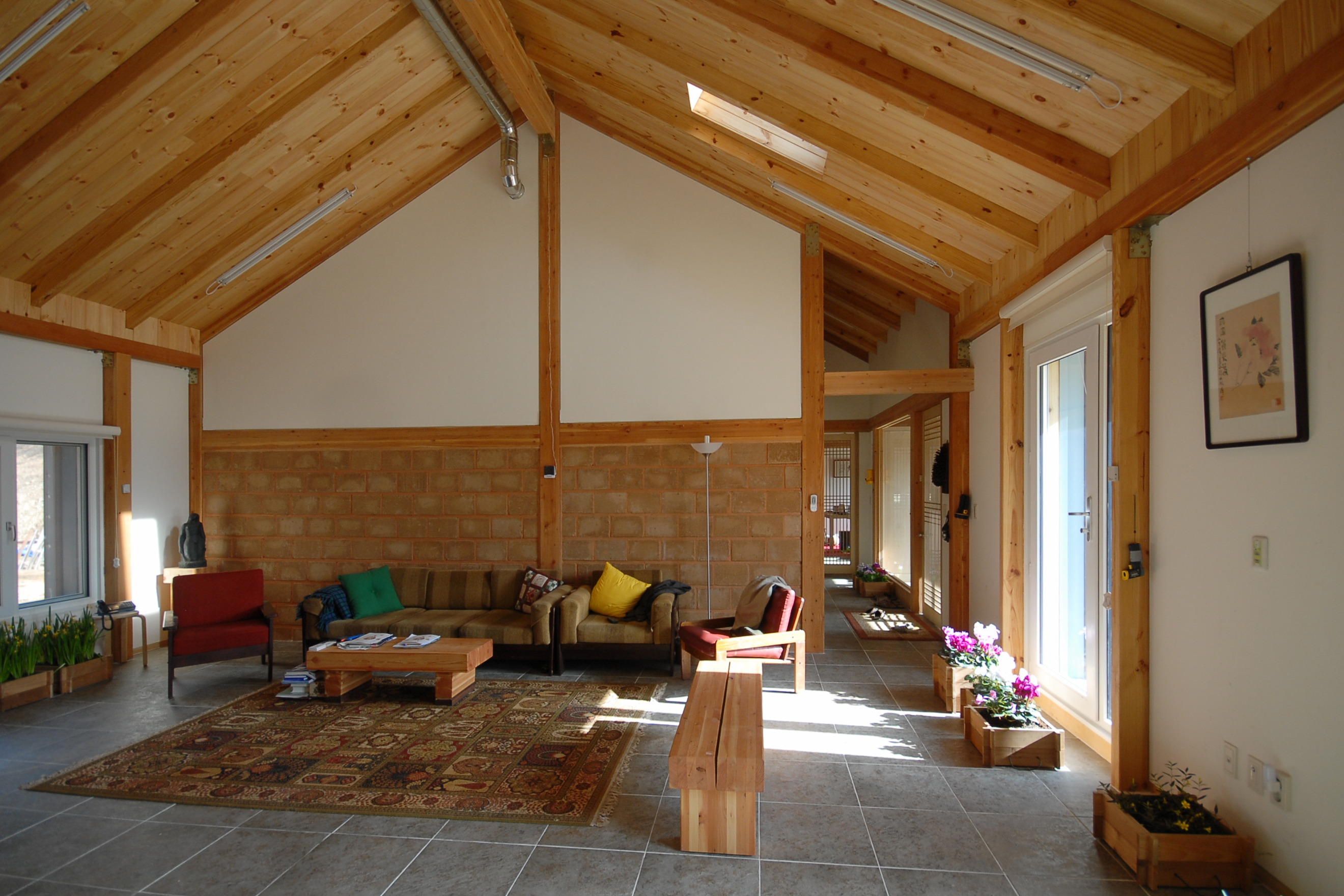 다음은 제 책의 사례로도 나오는 살둔 주택의 내부 전경사진입니다. (출처 = 월간 전원속의내집, 클릭시 원본사이즈로 확대) 목조+SIP(단열패널) 방식으로 인해 부족한 축열성능을 바닥을 타일로 마감하고 벽체의 일부를 황토벽돌로 마감함으로써 보완하였습니다.