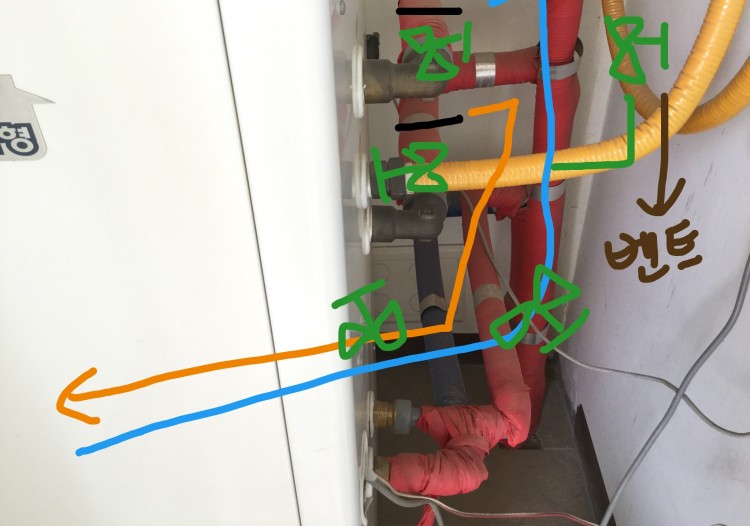 계획은 보일러의 난방 입출구 배관을 절단하고 보일러와 히트펌프로 가는 배관을 새로 하고 각각 밸브를 설치하는