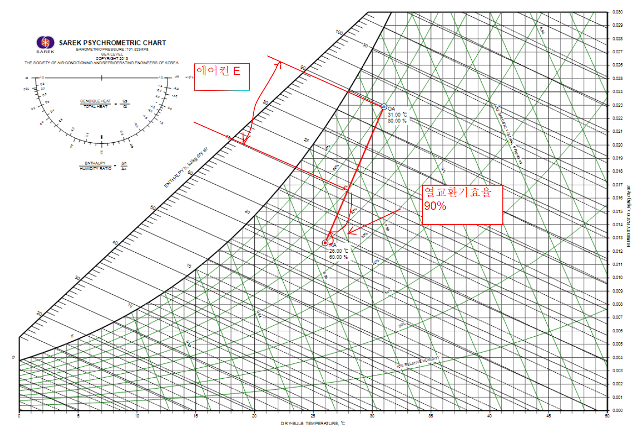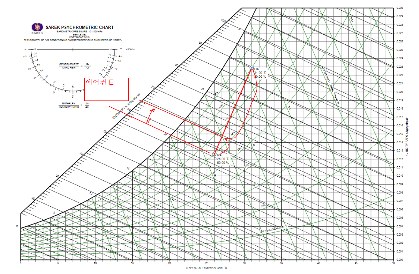 대류공조이므로 습공기선도에서 해석이 가능합니다. 31도 외기에서 26도 실내, 에어컨에서 32도->27-8도 로 냉각 후 다시 열교환되는 안입니다.