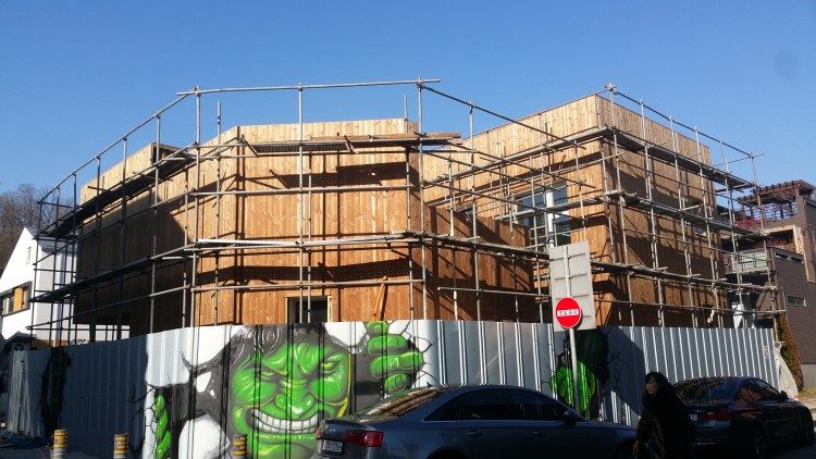 외부 마감재는 탄화목인 루나우드이며 하지재는 기존 각파이프 대용으로 GFRP를 사용하고 벽체 단열은 지상은 경질폴리우레단 밀도 24k 200mm 지중은 XPS1호 105mm를 겹시공하였습니다. 지붕은 XPS 1호 315mm입니다