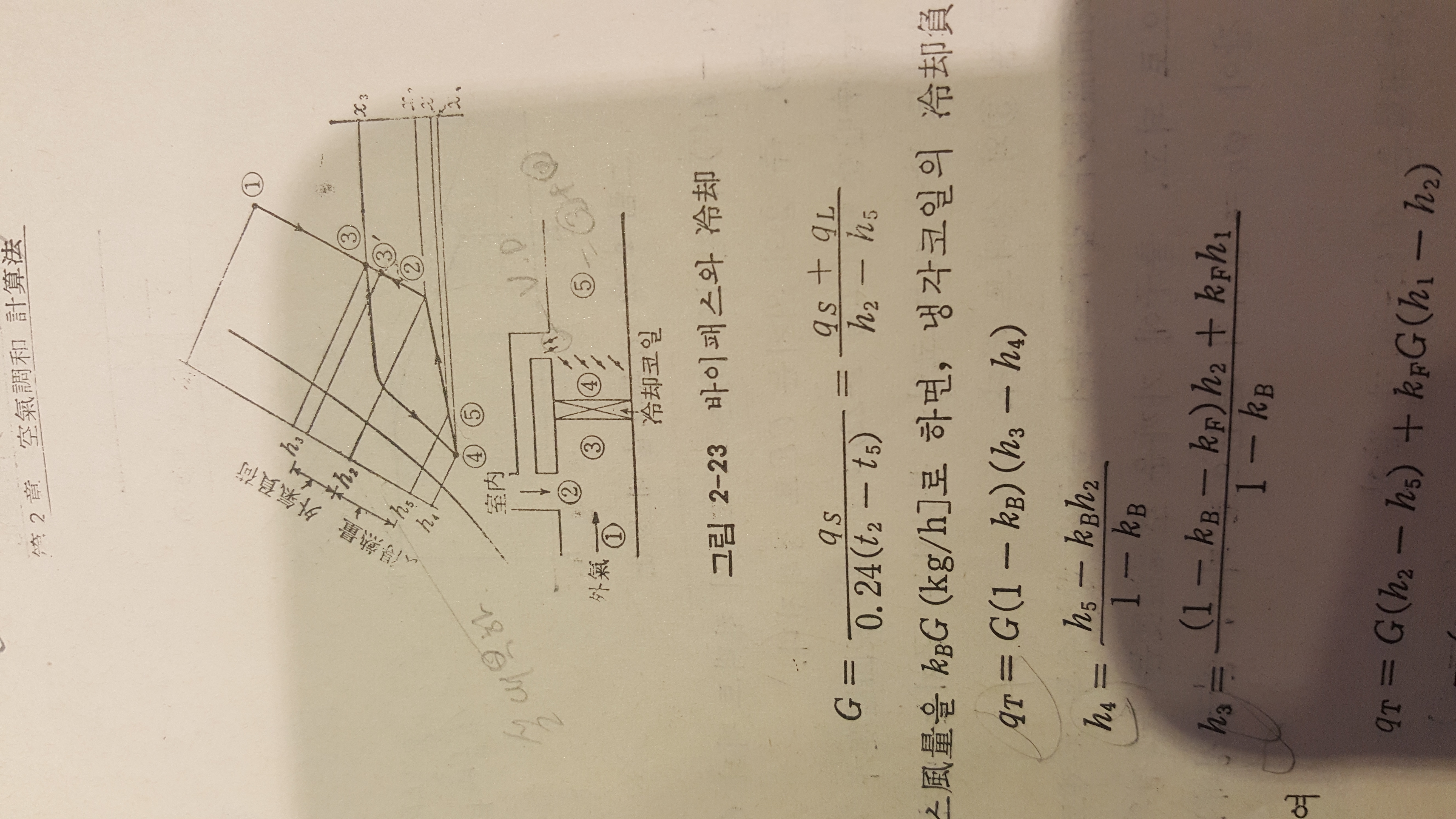 현열교환기의 열교환 후 급기된 외기와 실내공기가 혼합되어 혼합공기를 SHF로 ADP와 기기온도 증가를 고려한 SA출입구 온도로 일반적 추정으로 표시했습니다. 기기통과 습득 현열은 팬코일로 미미할 것으로 보고 생략했습니다. 그리고 수냉식 팬코일 냉방방식은 복사냉방방식으로 분류하지 않은 것으로 알고 있는 데 잘못 안 건가요? 건축기술자이니 어여삐봐주시기 바랍니다.