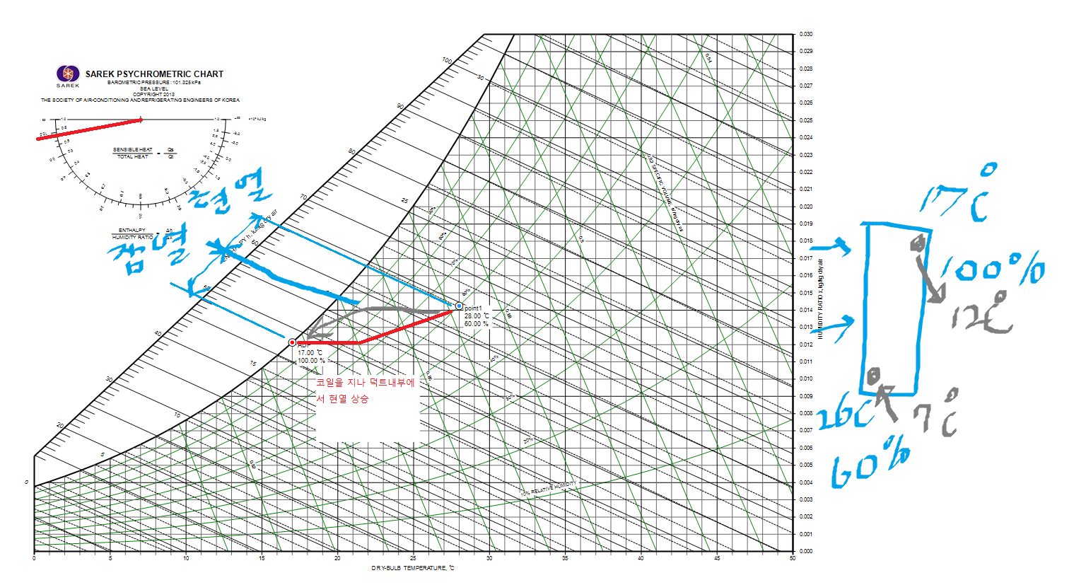 복사냉방은 현열만 처리하기 때문에 실내온도 26도 상대습도 60% 조건에서 풍량을 고정하면(풍량은 온도 조건에 따라 변경되는 것이 아님) SA로 투입되는 공기는 17도 상대습도 100%이외에는 선택의 여지가 없다는 것입니다.