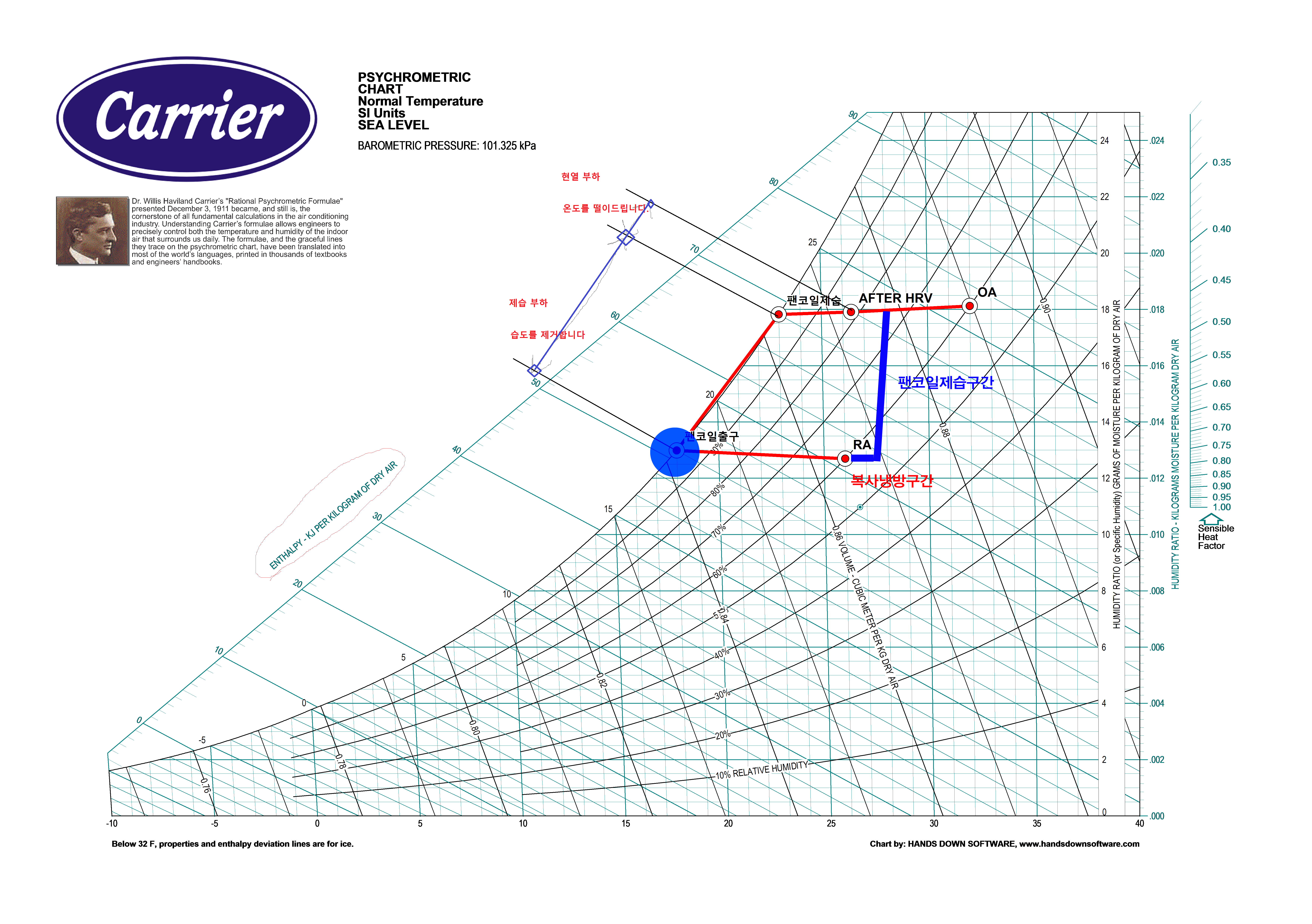 즉, 건공기라고 가정할 때 공기 1kg당 5KJ의 현열 처리 에너지가 투입되면 31도의 공기 1KG이 26도 공기 1KG이 된다는 것입니다.