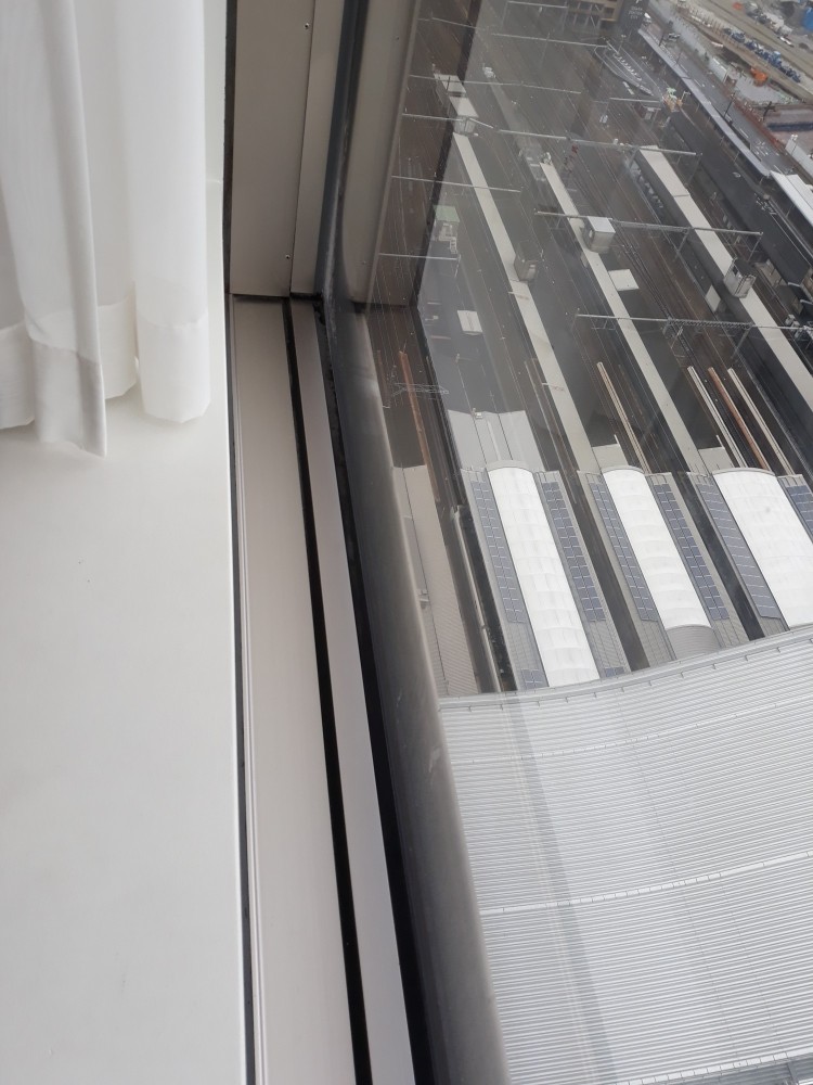 오사카에 갑자기 한파가 닥쳐서 체류기간 내내 최저기온이 10도 정도로 떨어지긴 했습니다만, 그래도 이 정도 날씨에 이런 어마어마한 우풍이라니 좀 심하다 싶었습니다. 자다가 깰 정도였습니다. 그래서 두꺼운 커튼이 있길래 치고 잤는데 아침에 일어나보니 유리와 주변 금속 마감에 결로가 한 가득이었습니다.