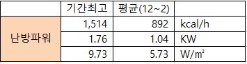 이 데이타에 따르면 출력기준 2kw 면 난방이 가능하다는 결론입니다.