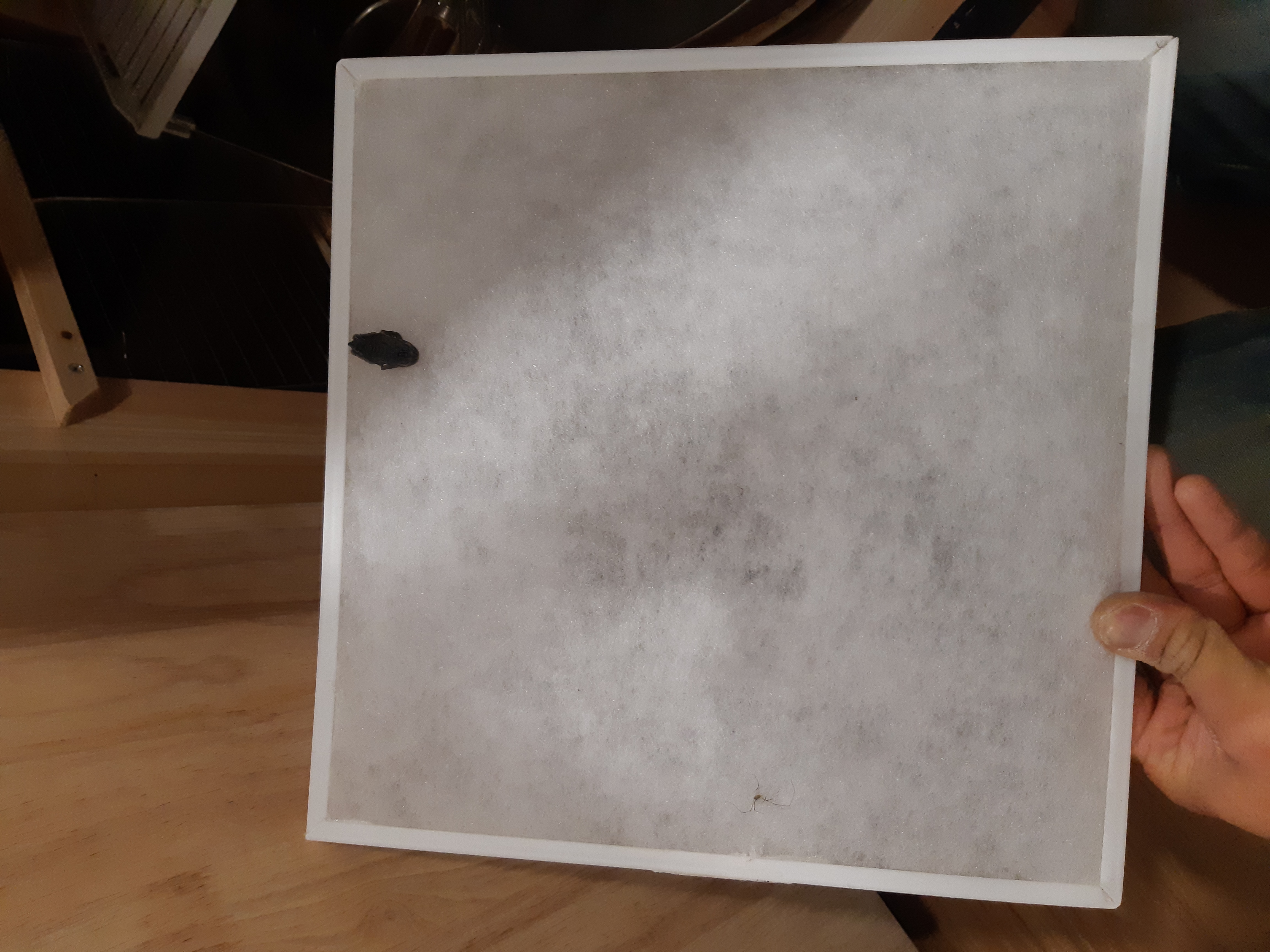 들어가서 필터박스를 보니 프리필터도 거의 새 것 처럼 깨끗했구요. 먼지에 막힐까봐 후드캡의 방충망을 떼고 설치했는데 작은 청개구리가 기어들어와 미라가 돼있네요. ㅜㅜ